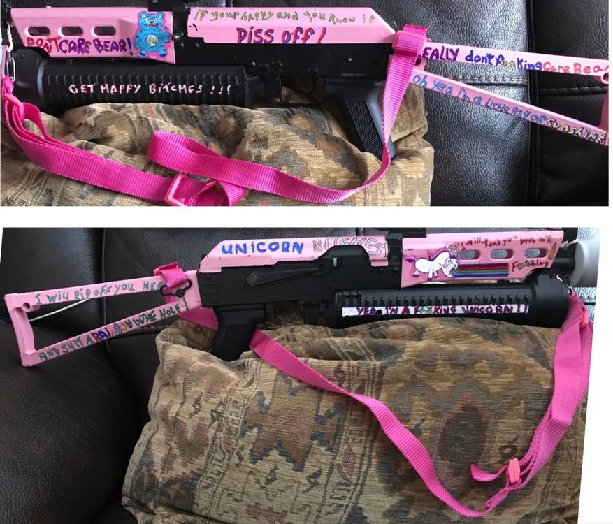 My gun rack. Not all r there. I have 2 others share with bf witch is a shoty anf baby cappa. From top to bottom New not skirmished yet star csi x5 Black and gray only fpr milsim. Pink high cappa shelby g and g ff16 carbine been upgraded had since late 2011 used since. Seen alot of wars unknown pistol c02 covered in black dimontys. there superglued on aint comeing off Tm Star thunder maul (ghost in the shell gun) in black and silver new never skirmished. For cqb It is the Japanese version not usa version.. all different is no orange tip the stamp on side is different also have full lengh clear riot sheld. And pink bfg.3 points