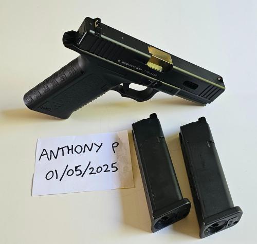 SAI G17 Gen.3 custom - in collection condition. Unskirmished, unscratched, excellent condition. Comes as seen (without the blades) as package. Not splitting the item. Thank you 🙏 VFC G17 Gen.3 base (new unused) Crusader V2 nozzle Steel tight bore inner barrel (6.02) Guns Modify SAI adjustable trigger HW RMR QR v2 red dot sight TLR-H1 high lumen clone light (3.0-4.2v) 2x magazines New magazine with EMG TTI gas extension base plate and Laylax Japan gas route. Used magazine with AMG hi output outlet valve , SLR gas extension base plate and Laylax gas route. Polymer custom angled flared magwell Steel SAI thread protector Maple leaf autobot hop bucking Trijicon logo metal strong strontium glow sights Full custom frame done by hand. Thinned, primed, 80% de grooved, grip angle adjusted (aims more like 1911), double undercut, mag release scallop, full tier 1 style LPI stippling (kept Glock logo), front thumb rest stippling (both sides). Postage £6.99 tracked and signed. PayPal F&F450.00 GBP