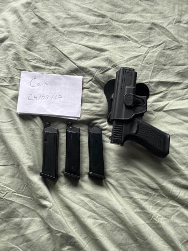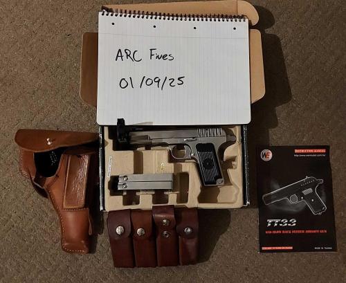 Selling my Chrome Tokarev with a Chinese leather holster lined with suede, and a 4 cell mag pouch which is leather. Not sure how old the mag pouch is, but it has a star on the silver buttons, maybe chinese? The Tokarev itself has a promethus purple bucking in it, fires around 0.9J with 0.25 and green gas. All mags are airtight and have been maintained well with Abbey 144a maintenance gas. I can chuck it in if the shipping allows it. Sad to see it go, this paired with my M16 or more recently the Mosin (both also for sale) have brought me many happy game days. Feel free to ask any questions Located in Fife for collection, or can send with parcelforce.120.00 GBP