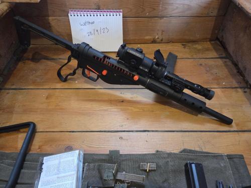 Hello hivemind! Ive hit the unfortunate place in my life where I simply must have a VFC G3 and as such sadly something else has to go. With heavy heart I'm putting up for sale the most shameful gun in my collection. It was an absolute nightmare to build and cost a fortune, I had to bribe a machine shop, a welder and kill a member if the airsoft taste police to make it happen. The breakdown is: - Northeast sten - £430 - airtac hpa adapter x 2 - £200 - mepro tritium/fiber ring backup sight - £130 - mpx stock - £120 - wood foregrip - £30 - cherokote - £260 - carry bag - £30 - welding/machining £200 It started life as a Northeast sten but I wanted something more modern so I milled a rail from steel and welded it onto the body, at the back end i machined a cutout for a mepro tritium sight to act as a backup. Whilst I was at it I bent some steel and then machined and welded on a picitinny section for a stock. Therefore giving birth to the most uncomfortable pistol grip in existence (it grows on you) I ended up with something functional but looking like it came out of metro, covered in rust and weld burns so I had it sand blasted and cerokoted in black with all the working bits orange so that I could keep an eye on their condition. I should have kept the working bits black too but its pretty easy to do that if you wanted, the orange looks a bit ...... off i think. Right now she functions perfectly but it looks like the nozzle spring has snapped, not to worry though as ive got 2x brand new spares for you ready to go. Send me a message and i can send you videos, close up of the milling and welding etc. The scope and torch ARE NOT included, or are at least available separately and not part of this listing. Ive got the shell of the original mag but it was gutted to feed the hpa adapters parts. All in all she cost me £1370 to build. 80% of that is £1096 so I would like £1100 to make it a nice round number, its most definitely the most unique sten out there, and you can have the 40-60 hours of labour it cost to build for free 😀 Happy to discuss trades for a VFC G31,100.00 GBP