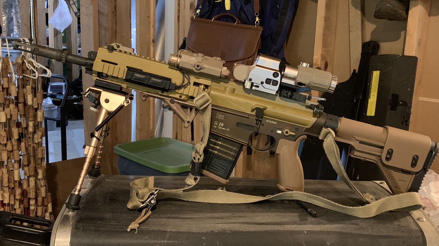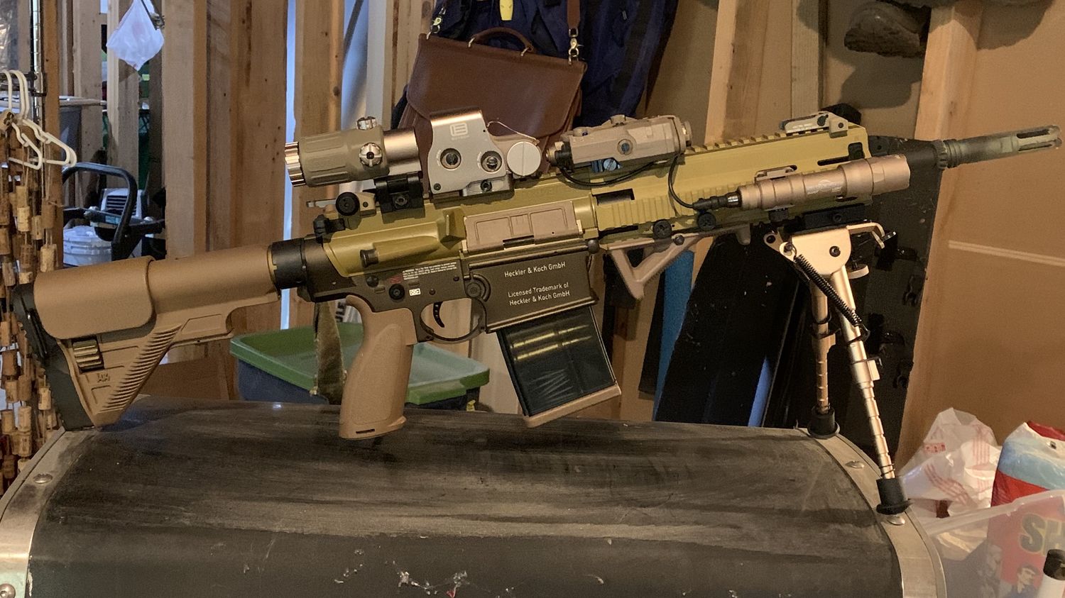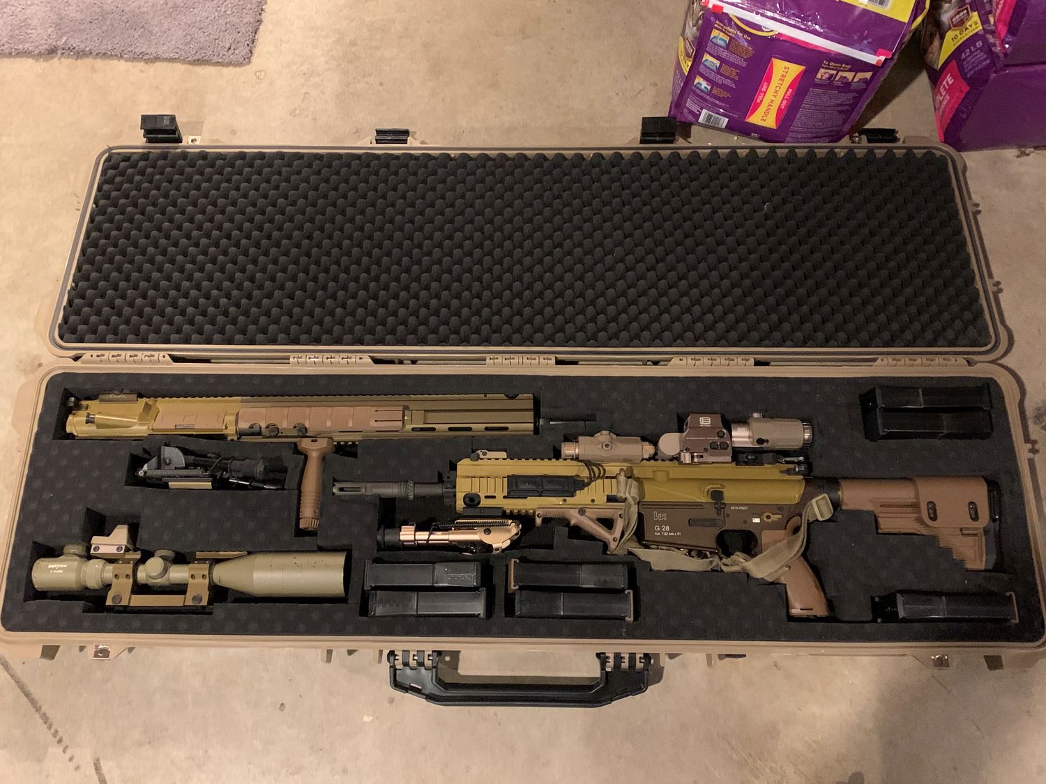 Well, thats another quarantine project done. Introducing the HK 417a2. It started life as two G28s; G28 LE #227 and G28 standard #IDontCareEnoughToCheck. #227 was my original G28 LE that Ive had for awhile, but it just kind of sat around as it was heavy, loud, and comparatively ineffective at range compared to my other DMRs. I wanted to upgrade it, but I wasn't sure what to do. Then comes the standard. I bought the standard off a secondhand airsoft app in November of 2019. It was a bastardization of a 417 and G28 - G28 receivers, grip, and outer barrel, but 417 buffer tube, stock, and rail. I didnt really care as it was dirt cheap and already had some decent upgrades in it. Turns out I should have cared, as not a month later the lower receiver cracked. Real bad. It may be repairable but itll be obvious. So I was left with a semi-upgraded but broken G417 and a stock G28 LE. Now, between these two I built a 417 for a mate. I believe I posted it here, but it involved making a custom fitting to mount a PTS UBR stock to it. I looks good, and works well. It also gave me some experience building 417s that I didn't have before, and it gave me an appreciation for the "Battle Rifle" class of weapon. Essentially, a BR is a carbine-length DMR. This would include short-barreled AR-10s, Scar mk17s, etc. In airsoft you follow rifleman rules. It just looks fancier. Around this time I started toying with the idea of creating my own BR, but in typical Spaz fashion it had to kind of stand out. Knowing how much of a pain VFC mk17s are to upgrade, I shied away from them, but 417s are expensive, with an approx $450 price tag. Add in the $500ish in internals I would have to do to field it and things weren't looking too good on that front either... Plus, there arent many aftermarket externals for the VFC 417s, and my squadmate already runs the one I built him. Then this broken G28 shows up and I had an idea... Until this year, I always preferred my guns having a dedicated setup. My M27 stays as it is, its sights are zeroed, I dont pull attachments from other guns, etc. However, with me recently turning my VFC Jag Arms PHX-15 SBR (see previous page) into a hybrid Krytac LMG with a second upper, I started thinking of doing the same with my G28 LE. I mean, if I built a lower based around trigger response why wouldn't it work in a DMR as well as a BR? So I began working on it. In this period I saw the news from SHOT that HK had revamped their 417 program into a new model - the HK 417a2. Shiny, new, not made in airsoft to date, and best of all - in RAL8000, just like my spare G28 receivers. So to begin I stripped the 417 sniper parts off the standard and sold them. No need for them, so why not. Ill make someone else happy. Bought a 417 short rail off someone selling one. Ordered a short outer barrel and gas impingement system from VFC. Started asking for quotes from various techs I trust on AEG gearboxes. Started looking into HPA as well, cause why not. Decided to go HPA as it'd be about the same cost, and more importantly, much quieter. Ordered a REVO kit from Italy (3D printed kit that allows the G28 to take aftermarket triggers, more HPA engines, standard M4 hops, and more). Ordered one of the new Wolverine Reaper Gen 2 Premium engines. Ordered a speed trigger, the internals needed to make the revo kit work, and an r-hopped barrel from the guy I always get my barrels from. Then it was onto externals. Ordered a fully trademarked Eotech XPS, G33 magnifier, KAC irons (closest I could find to gen 2 HK 417 irons - wasnt going to pay that much for the real thing - the rear sight alone is $300...), a Magpul AFG, a Surefire M600DF, and one of my signature blue-lasered PEQs. Rail arrived, and it sent it off with another project that will be unveiled here soon to be cerakoted in RAL8000. Rail returns, and most attachments come in. Decide I need a case, so pick up a Eylar 53in rifle case. Big, but i figured I'd need it. Case arrives, REVO kit arrives, Reaper arrives, bipod ordered and arrives. Install what I can, but Im still waiting for the order from VFC. Rest of the externals come in. Barrel from VFC finally arrived this morning, so in it went, gun went together, foam was plucked, and the HK 417a2/G28 project was complete. Now I can switch back and forth from G28 or 417a2 on the field depending on the role I want to play. The REVO kit also allows for full auto, so if the game allows it that is available. A fun project, a real head-turner (I hope), and it should have excellent range and accuracy. Im happy. Every part that should be is also trademarked, which really adds to the overall look.16 points -