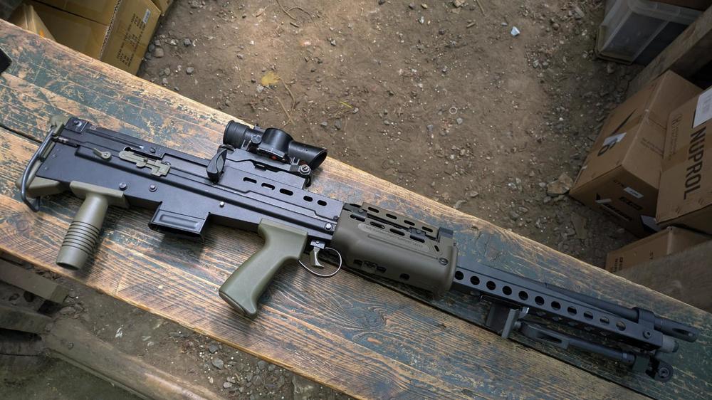 So been working on this bad boy. Still not finished. But its getting there... So it's an ares A3 Managed to fit the angry gun mlok rail to it. Added the C Reinforcement sections. Hka3 added to rear. LLM03 3d printed Not seen in pic is the QR codes added to both sa80 and os4. Still to do; Laser engraved the os4 Make a pressure pad and 3d print the coupling. Weather it all.15 points -