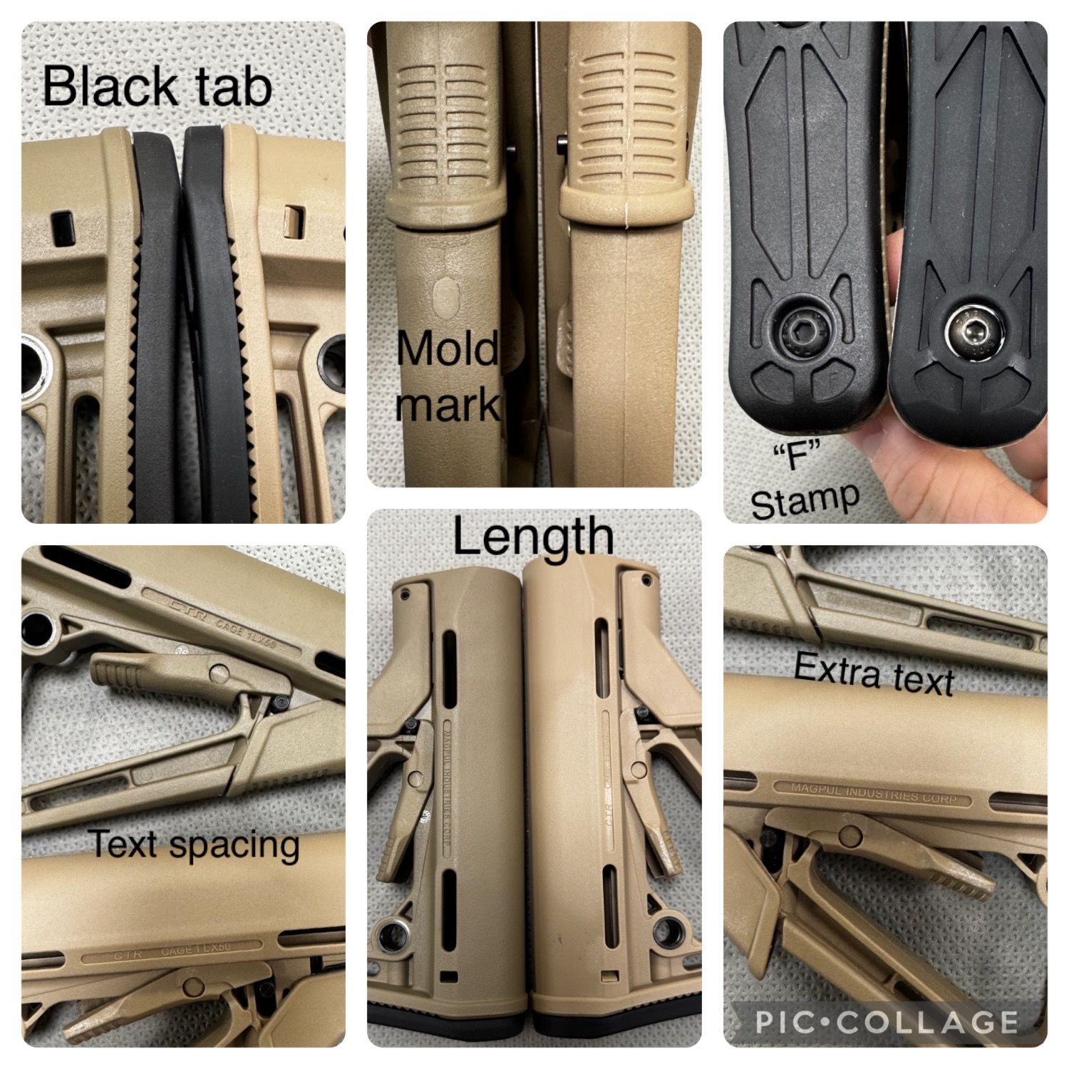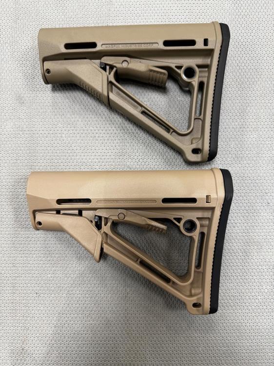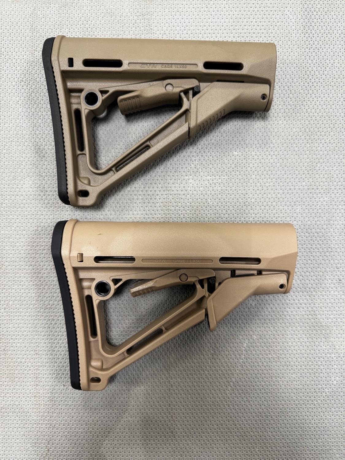 With the clone wars stronger than ever I thought it might be an idea to have a thread based on how to spot what’s real and what’s not , to be clear this is not a clone bashing thread , but simply a way to hopefully help you get what is advertised , be it parts , optics , lasers/torches or maybe even RIF’s themselves . just because it says Aimpoint/Eotech/Magpul/Surefire doesn’t mean it is , even the packaging is being cloned to a high standard so don’t get get duped . I’ll start with a simple Magpul CTR stock in FDE , there will be better clones than others and I’ve picked a “Tak Tak” variant which retails at around £15-£20 in the UK VS a Gebuine CTR which retails around £75-£80 , the clone Says Magpul on it so in passing looks legit , the biggest tell is usually going to be the colour but as we know everyone’s photos and lighting looks a bit different and if you have nothing genuine to compare to when it arrives you are just taking the sellers word . heres a few comparisons , and highlighted differences between the two which should be easy to spot , Genuine is CTR is either Top or to the Left . main points to note - Genuine will have black tabs where the stock pad locates NOT TAN Genuine will have a molding mark on the underside , oval shaped . Genuine stock pad will have an “F” in the lower right hand side “pocket” Text spacing , the Genuine will be bolder and spaced correctly Length , generally the Clones will be a touch longer . Extra Text , the genuine will have extra text in the lower frame , plus batch / manufacturing numbers just above the locking lever . Hope this helps , as time permits I will add more comparisons .12 points -