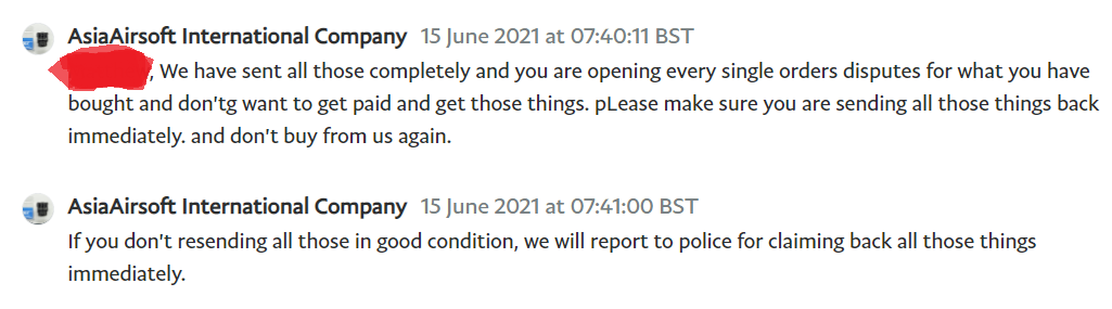 Right my order has come through so i'm going to document it so nobody else makes the mistake of ordering from these crooks. I placed my order on the 21st of Febuary and it wasnt shipped until 17th March with no communications. a few days later a single loading nozzle arrived. The rest of the order finally arrived on the 14th of June, I finally opened the package and that is when alarm bells immediately began to ring as I was confronted with the following: Upon opening i found the follwing missing from my order: 1x xm26 shotgun 1x pack of shims and the other xm26 was missing its included shells. This was just half the issue though I also ordered a JG G3 SAS but received the following: This is defnitely not a JG its a clamshellbody held together with screws and a v3 gearbox, after some research by my tech it turns out to be a god aweful L&H. I also ordered a WA loading nozzle and was sent the wrong one it was not WA compatible and was already opened alsongside that I ordered a 5KU WA outer barrel but was sent the following: The barrel is clearly secondhand and has already been fitted and used and is not of 5KU quality. As such I opened a case on Paypal reporting these issues and immediately received the following from them: Unless I had the dying need to have half an order sent almost a month after payment needless to say i would never shop with them again anyway but honestly I was gobsmacked by this response. After paying the steep cost of return postage I have now been told that they will not be refunding my postage costs. This is the second order theyve completely screwed up for me, please learn from my mistakes and never place an order with this utter disgrace of a company.