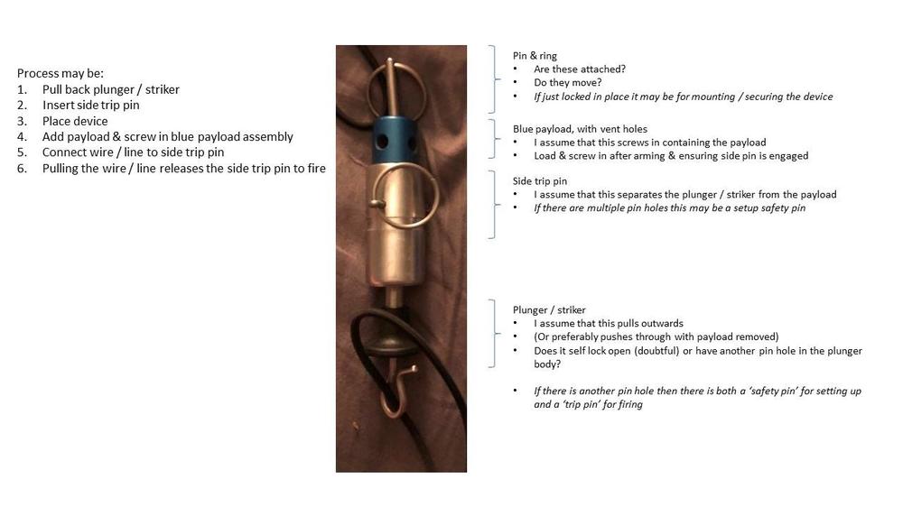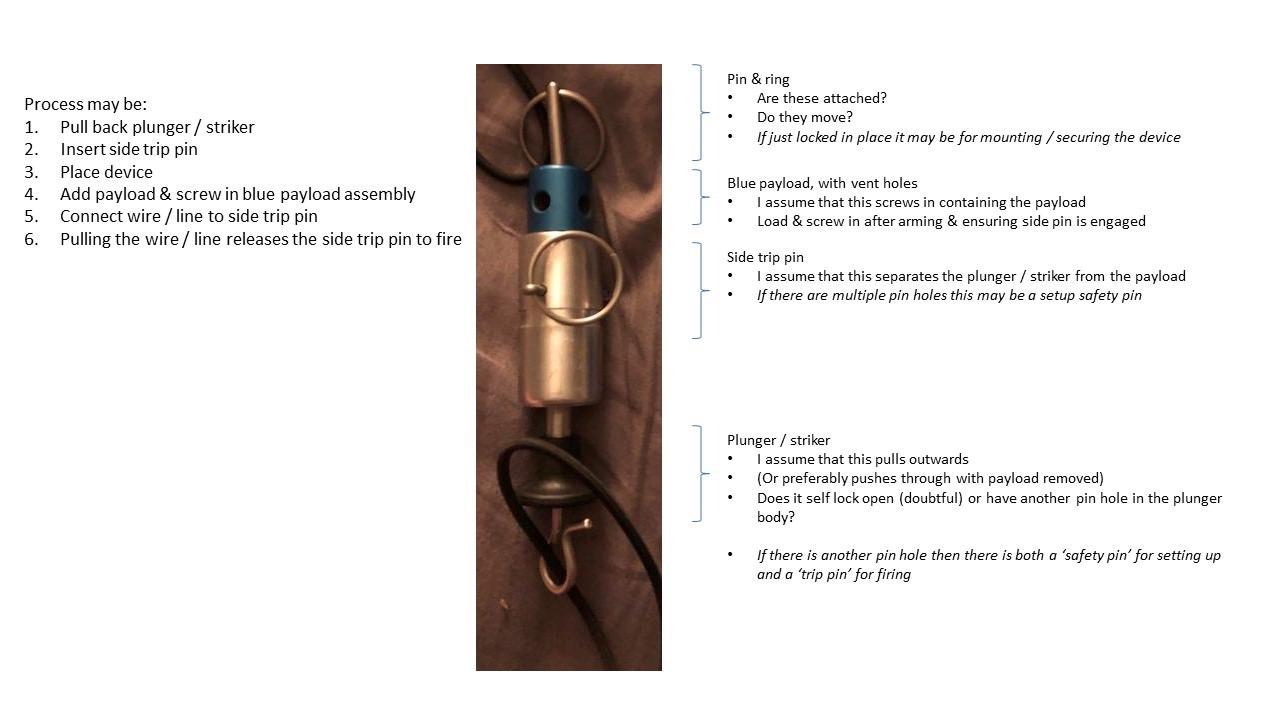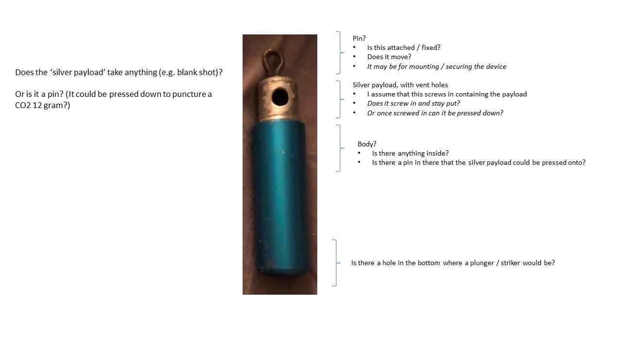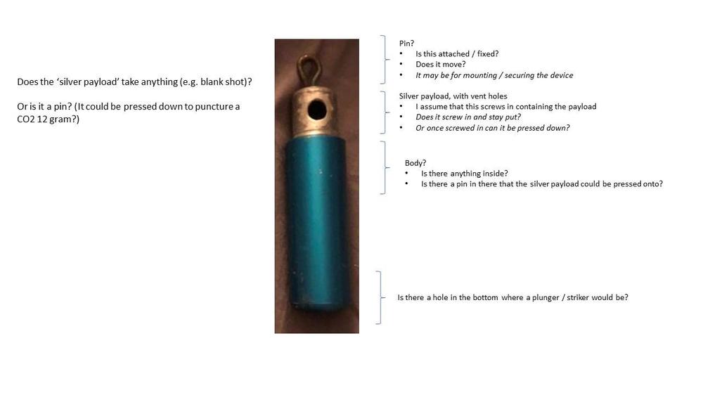 Going in blind, I’m assuming that it’s a blank firer which sets off by a striker pin on the the plunger But devices can be many things, blanks, crow scarers, 12gram co2 cartridges etc the holes look like the safety side vent of a blank firer. More information is needed -