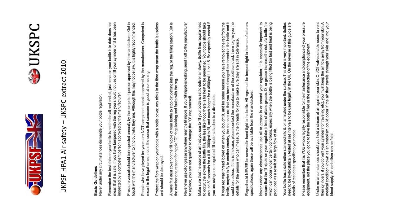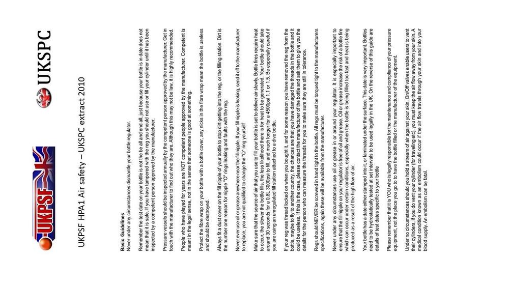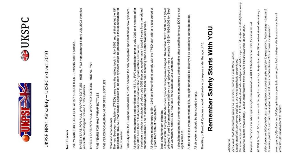 Some extra general awareness on air cylinder safety: The HPA1 air safety document was originally produced by the UKPSF (UK paintball representative body), and the version below is as distributed in 2010 by the UKSPC (a collective of event organisers), and has some additional comments of my own