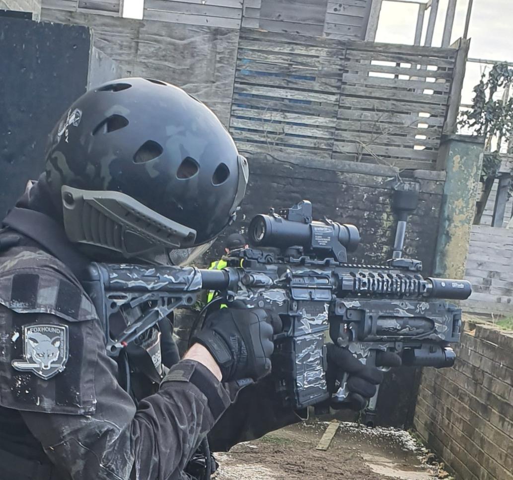 Latest addition to my arsenal, brought stock from an owner on here and modified over the last week, a TM Saiga 12, added a new front end, cut the barrel down, added a new muzzle, changed to an m4 stock oh and the 1500 round HPA mag.