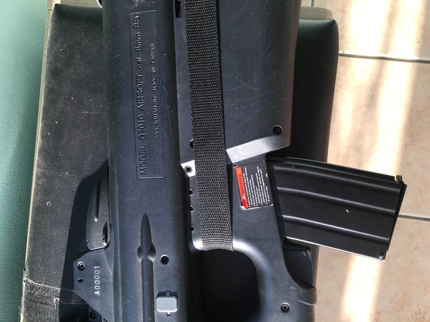 11. OK, so does this serial number mean anything? I bought it non working at an auction at LAC's The Farm, apparently it belonged to an old guy who collected and had had to give up ether due to ill health or he had passed. I've not seen anything in google image searches, all of them either have later serial numbers or not at all. It's black, in good condition, no "Real Steel" trades, marked Model G2010. Could it really be No1? And what's it worth? It's now been serviced by a good local tech* and he did a great job. It works well with the recommended Maple Leaf 60 degree, reaches out very nicely and now the rubber is worn in it gives me a nice little range advantage over the average AEG. (First time out with it I was picking off a group trying to flank us and as they tried moved out of range the hop was wearing in, I kept adjusting it and hitting them until they were driven to the edge of the field! I swear I was getting over 60 yards.) It's nice, compact and swingable straight shooter with a decent length barrel, takes standard AR type mags. But... Despite that it ticks all my boxes theoretically as the bullpup I've been looking for, I don't find the angle of the pistol grip and front fore end very ergonomic. Why FN made them those strange and uncomfortable angles I can not fathom. Not really sure about the fire selector either. It's good for ambis though, so there's that. *TheButchersShopAirsoft