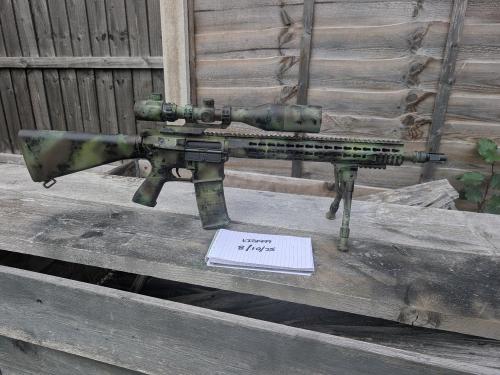 Spr style rifle set up as dmr .safe and single fire ASG full metal base gun . Comes as see with pics set up for spr style rifle sprayed in woodland style camo . Lovely big scope on one piece scope mount Bipod . Gearbox has quick release ( change spring thru back of receiver) electronic g&g trigger with mosfet 6.02 brass barrel (450mm length) Flat hop and nub on rotary hop unit set up for 0.4g BB Shoots really nice and flat with 11.1 lipo Can throw in 11.1 lipo and battery charger if wanted
