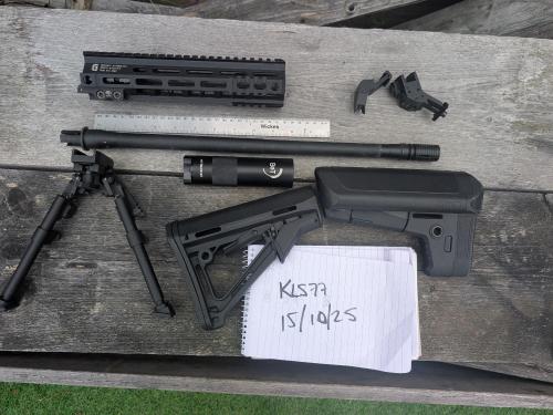 Giesselle mk4 9.5" rail. Been used . Has. Some marks but good condition . Has all bolts and fittings sold Vfc fully adjustable bi pod . Hard to get hold off . Robust bipod £35 Kytac stock. £25 Ctr style stock sild 14" heavy m4 barrel with birdcage style flashhider ( dmr) £27 Canted front and rear sights £12 ASG by tracer . £20