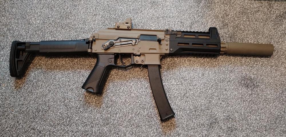 Here is sort of what I just bought - came back on Saturday, but the tech has been working on it since Jan 29th. Before that it was cerakoted in FDE. It also doesn't actually work despite being upgraded heavily and got smashed up a bit by courier. A wire pops out on the mosfet, the stock catch is broken and there are scratches on the cerakote paintwork - but it looks cool and that is all that matters in airsoft haha! -