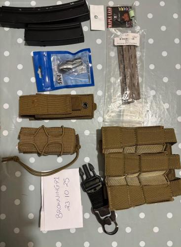 Peq 16 painted battery box - 8 silencer 14mm CCW 190mm - 10 G&P Kac vert grip tan - 10 MP5 mid cap mags. Both -10 MP5 k muzzle thread adapter for Marui- 7 Tan Mlok rail covers - 5 WAS pistol mag pouch - 10 Tasmanian tiger pistol mag pouch - 8 One tegris triple SMG pouch - 10 Blackhawk sling clip - 5 Maple leaf hop 50 rubber- 5 Postage £3 Discount on multiple items.