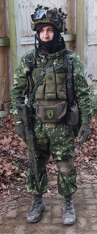 2. Here's me looking a bit awkward, twice. - Russian 'Flecktarn-D' camo (Kula Tactical) - Heavily modified (by yours truly) Chicom & scrote pouch - Mich helmet with Pencott green zone cover (from my other loadout) - Bolle x800 (highly recommend) - Mechanix gloves - Cyma AK - Battle belt, with Dynatec BFG 9mm (timed) in a pouch, Russian water bottle pouch (out of shot), dump pouch (out of shot), Blackhawk silencer pouch (that I use for carrying spare mk5's, also out of shot), WE Makarov (silver...for stealth) in an original soviet closed leather holster (out of shot), general purpose pouch (for extra ammo, spare mags, etc. out of shot). All pouches are OD. The Russian gear purists will probably balk at this cobbled together bunch of stuff, but it works for me. My regular sites are woodland, as you can probably tell, but this was taken today at 'Invicta Battlefield Black Site' in Kent - a great new site; CQB, with great games, balanced rules, and brilliant marshalls.