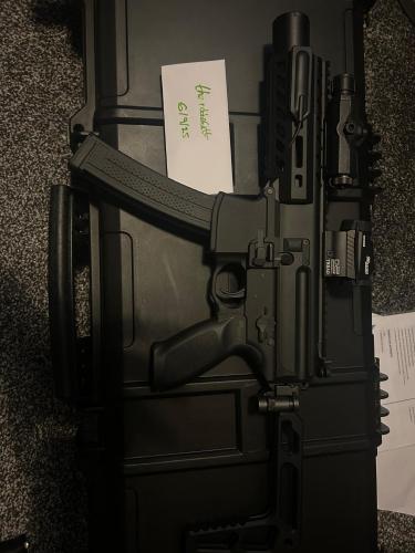 Selling this rare collectible TM MWS with angry gun John Wick conversion kit and extras. The Angry Gun John Wick conversion kits were very rare when you could get them and extortionately priced. It is built around a brand new Tokyo Marui MWS Block 1 and internally it is stock MWS apart from a Modify Tan Bucking and a Layla Prometheus 370mm 6.03 barrel (the original 350mm TM Barrel is also included) and an Angry Gun NPAS so it can be used as a DMR or as a general assault rifle. The fire selection mechanism is currently unmodified so it will fire both single shot and full auto. There are also several upgrades including genuine Strike Industries Straight Trigger and Forward Assist Button, genuine BCM Pistol Grip and Foregrip. It is fitted with a Vision King 1.25 - 5 × 26 Scope with illuminated reticule. The reticule colour can be set tor Red or Blue and has multiple brightness settings. It is fitted to the Rifle with a genuine Giselle Scope mount (stupid expensive for what they are). I purchased this from somebody which was the above listing, have fitted a new NPAS as it was damaged, everything else is as listed as the quality is amazing. 3 mags included, not TM but I preferred these mags shown in photos. One does not hold gas but the other two do and shoot fine. 3d printed MWS mag loader included as well as the nuptial hard case with shadow foam insert. Acetech BlasterC tracer included as well as original angry gun compensator plus many other original MWS parts. very heavy and large so collection(Birmingham area) preferred or can arrange meet/dropoff. shows shooting at around 250fps but npas allows for higher if wanted. Can arrange more photos or videos at request. open to offers