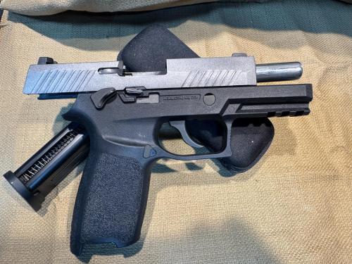 Selling this custom pistol. WE M18 (F18) , customized with cerakote rail in Sig Gray and polished barrel. Inner barrel with Male leaf bucking Gas-tight. Torch included, I also have an original Sig holster Original box PRice: 70 posted