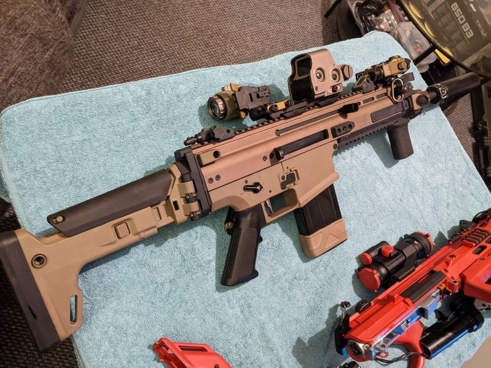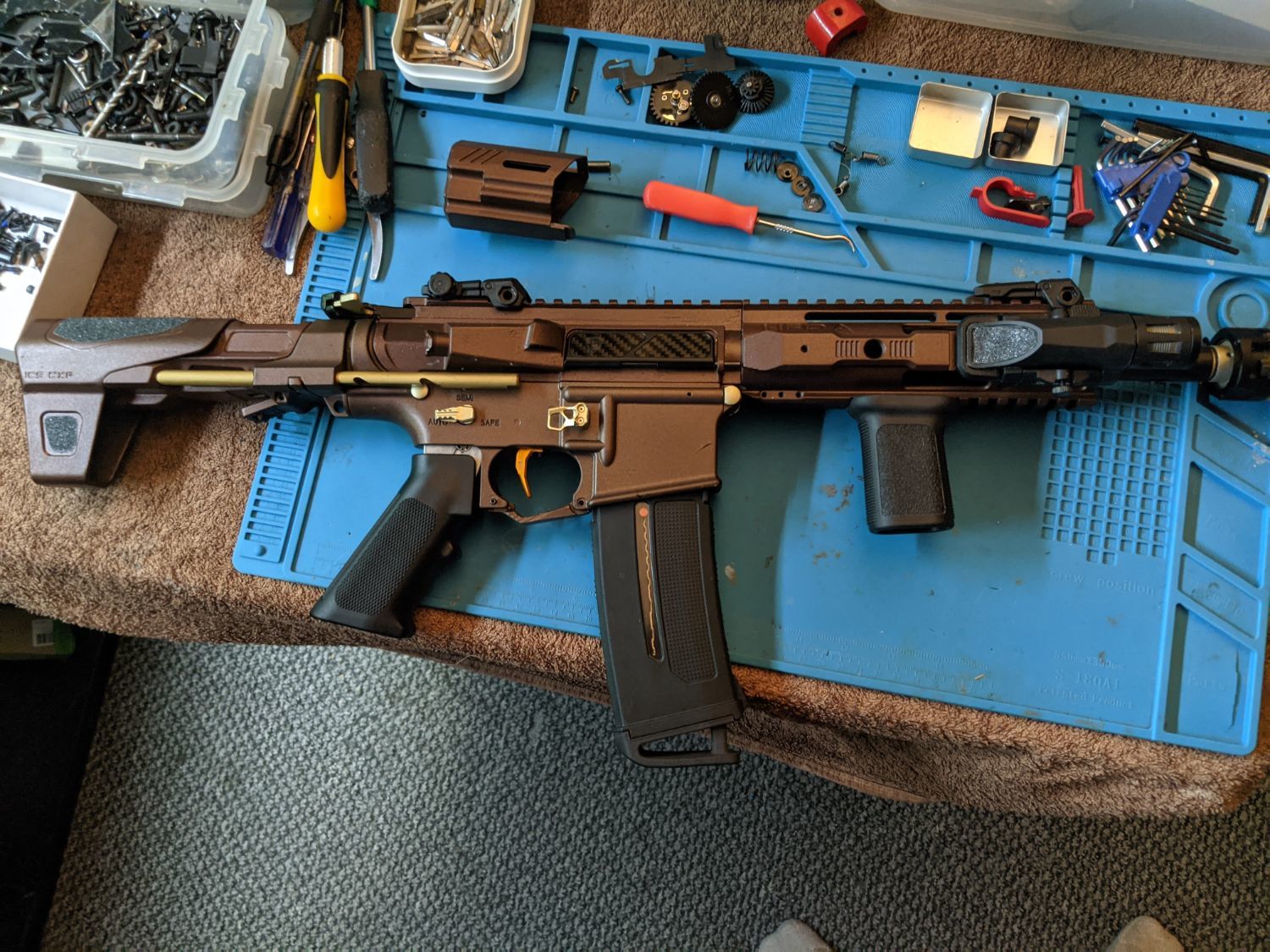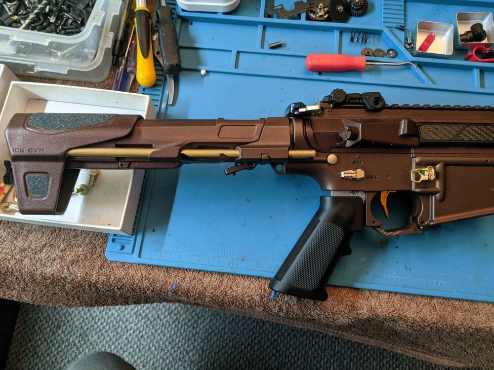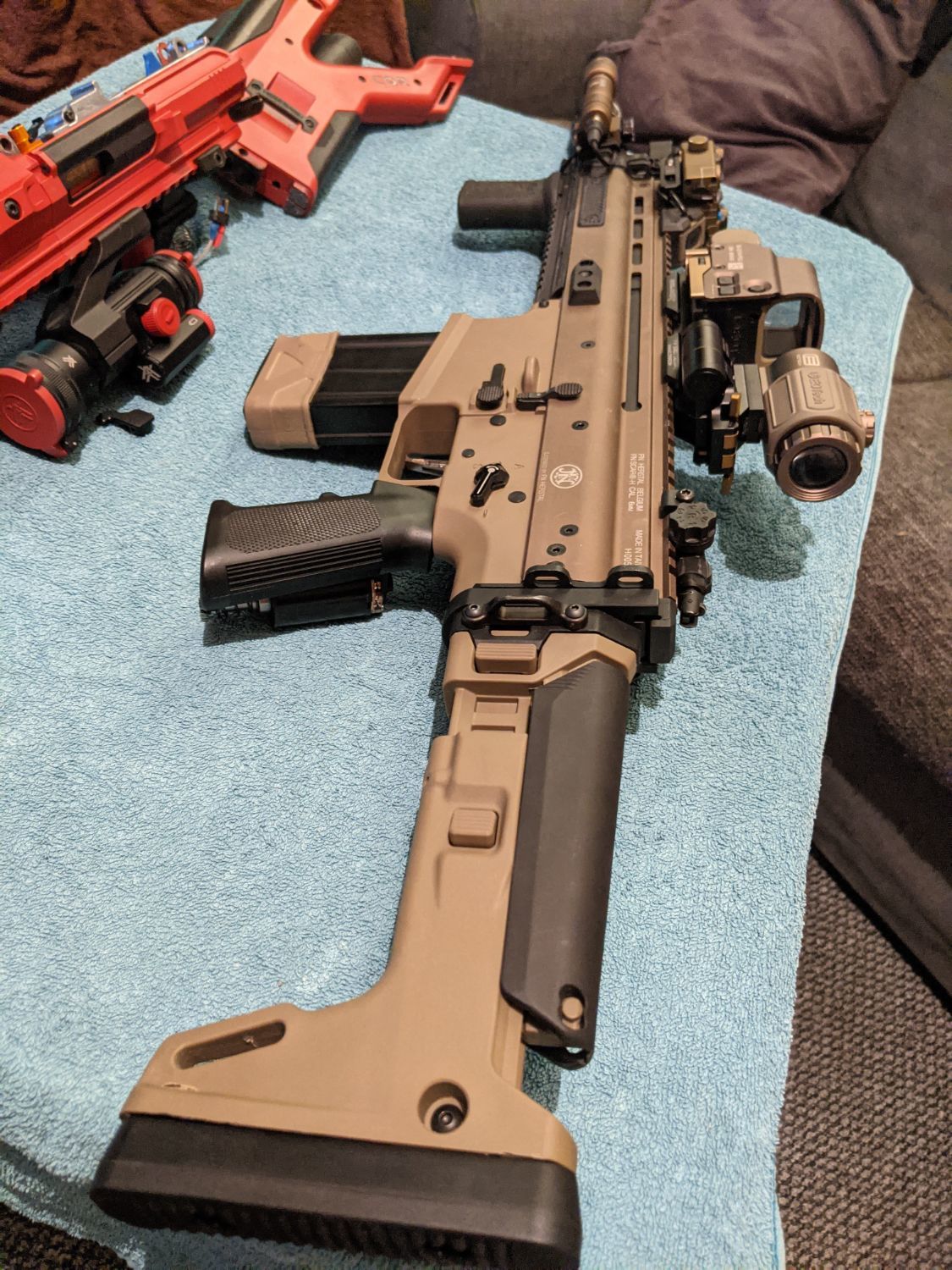 8. I'm waiting for warhead to get my motor back to me and I think I can finally call my SCAR-H 'Broadsword' complete. Real happy with how the two-toned stock came out, I had the cheekrest cerakoted black. (shout to Supreme Coatings) Just slapped the parts together because I wanted an up to date pic, grip is resting on a motor there..