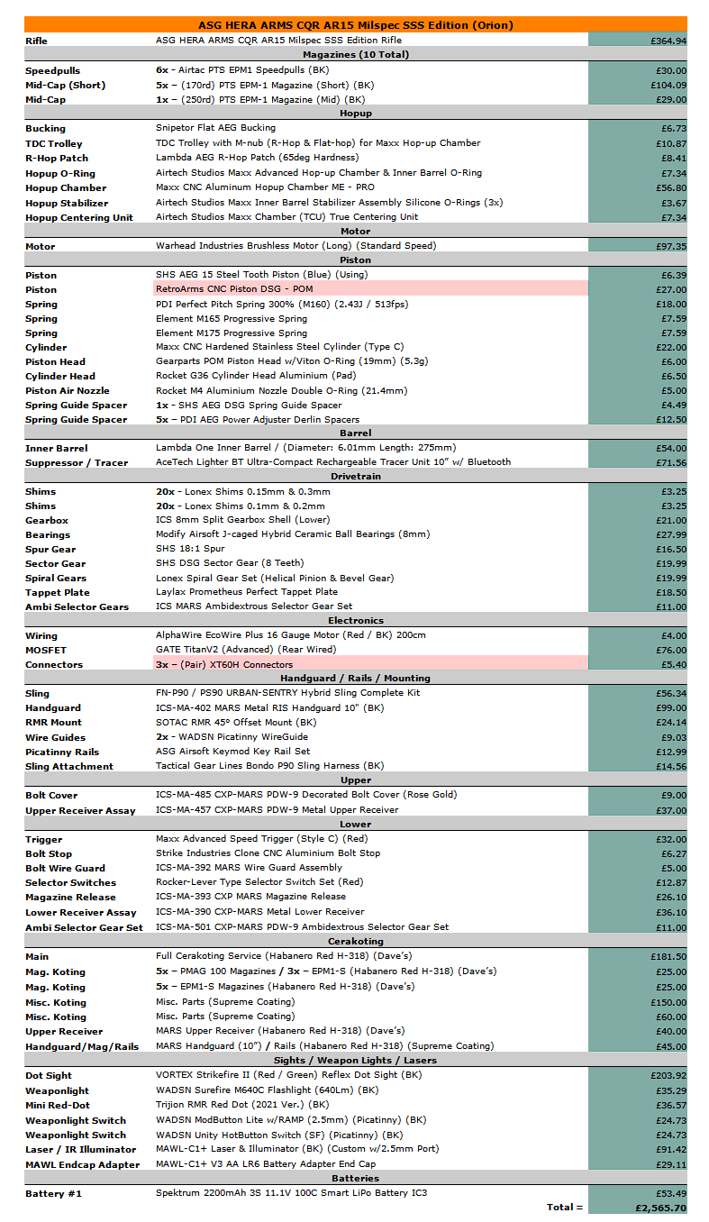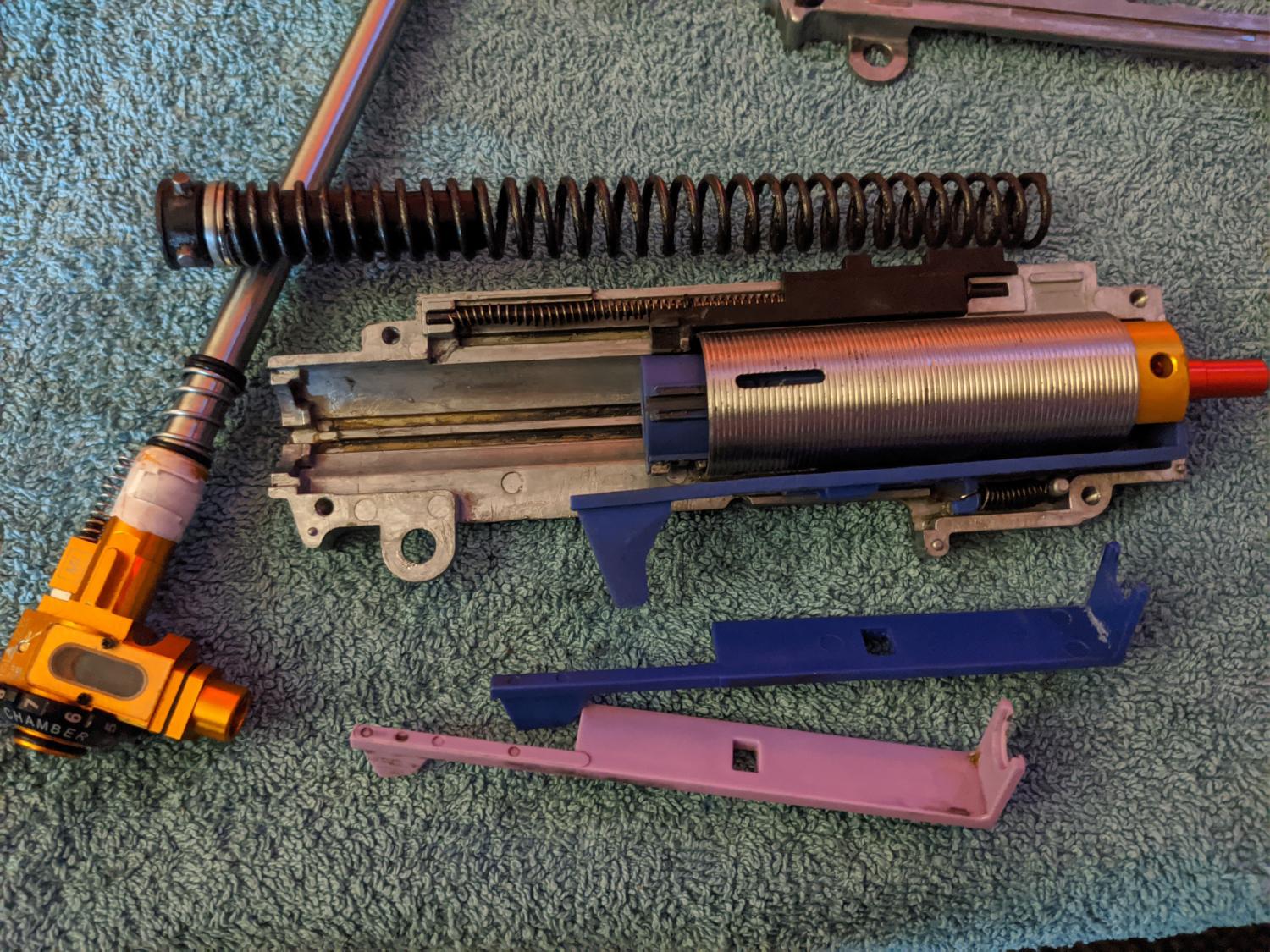 1. Since going from a small nuprol stick lipo to this after modifying my stock to hold it, I can't not destroy any piston I use. Spektrum 2200mAh 3S 11.1V 100C Smart LiPo Battery IC3 I started with DSGs, after breaking a few pistons and knurling the teeth on it and buying like 2 extras to keep trying, I gave up and went to 1:13, but it's the same, I've gone through about 10 pistons now, and this isn't my first build I know how to AoE and shim properly etc. Oh, I have also tried various strength springs along with spring guide spacers to make it super tight, no matter what configuration it just wrecks pistons. If it doesn't pull the metal rack off the piston and break the small plastic retainer on the front, it'll just grind down the teeth on both piston and gear. It seems like it's either too strong and pulls the rack off the piston, or the rack stays on and it just pushes the piston up and grinds on the teeth until it doesn't even pull. Yes have tried adjusting height of gear etc. I've honestly tried pretty much everything over like the year I was working on it, and just got fed up until now and since I spent so much money to build it I just want it bloody working. Have also tried about several differently cut tappet plates; (I haven't worked on it for like a year so just trying to find old pics now, got a recent desire to finally get it running.) You may have seen it before, it's the Orion; I have no idea what the setup was here but here's a clip of shooting at one point; https://streamable.com/isymmn It could fire like that for maybe half an hour before the piston breaks. Unfortunately it's an ICS gearbox. Parts list from my spreadsheet log; I was looking at the jager 2 piston; https://airsoftmutation.com/products/the-jaeger-mkii-piston-pre-order but it's expensive and I don't wanna just wreck that in 5 minutes too. Any real ideas guys?