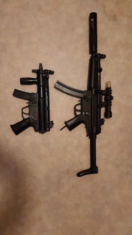8. Top one is an Escort with a singlepoint and a tracer unit hidden in the foam filled moderator, bottom one is an old Tokyo Marui (non high cycle) They both take the same mags which is a bonus.