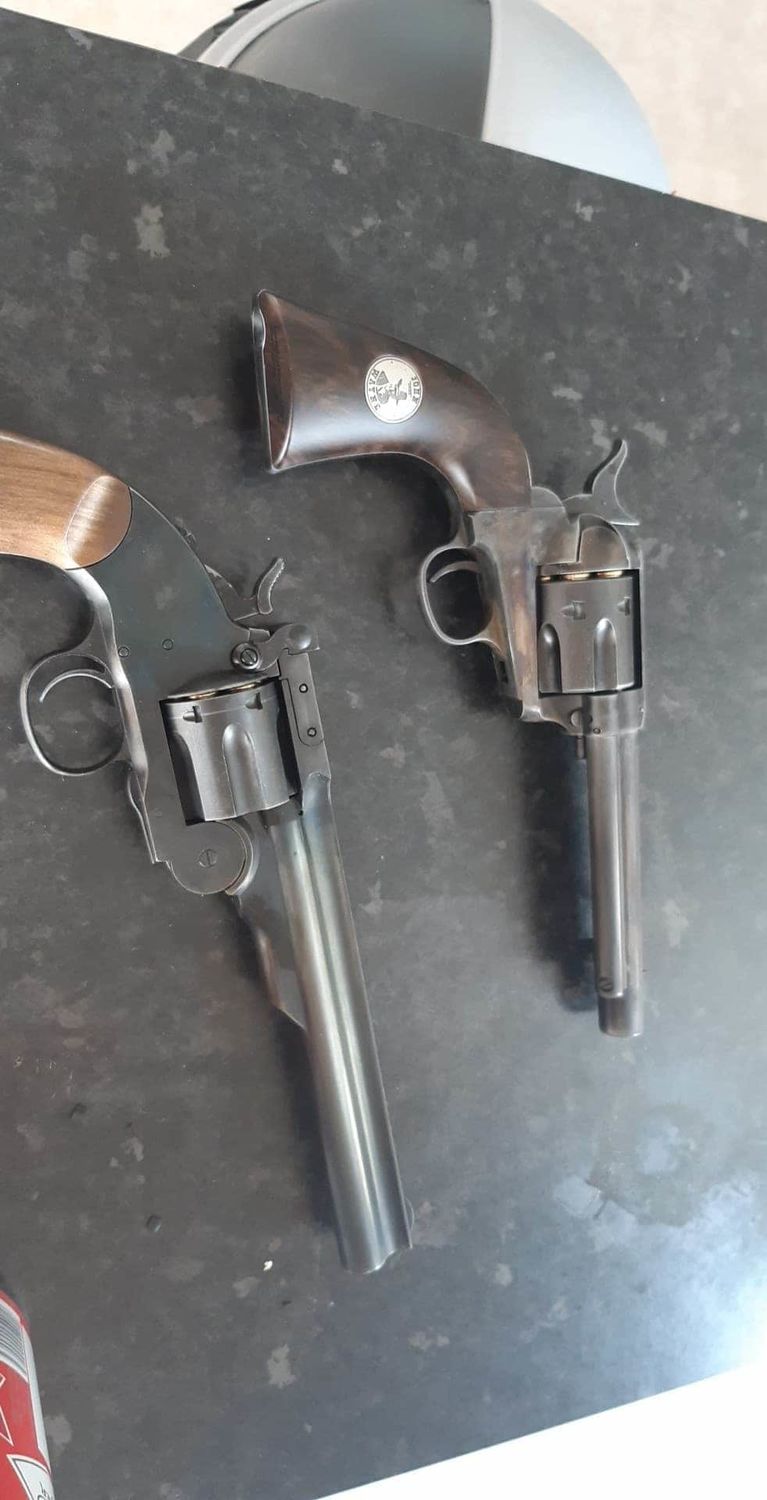 Ones an Schofield r hopped, the other started life as a boneyard .177 umarex pellet gun, covered in john wayne logos and with loads of writing all over it, fixed it, the accuracy was woeful, converted to airsoft, r hopped, refinished and just waiting for a pair of new homemade inlays to cure so I can replace the awful grip logos.