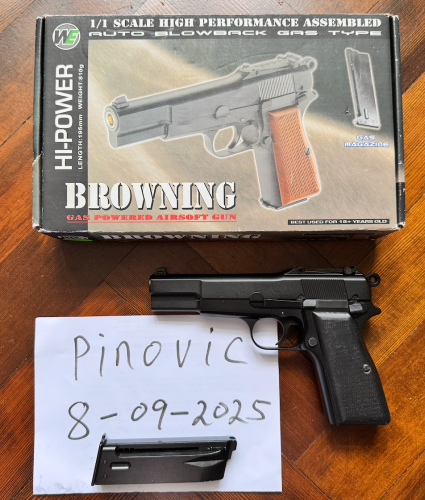 For sale is this WE-Tech Browning Hi-Power M1935 GBB pistol. I bought it for collection and have only fired it for testing. This is the hard-to-find Mark 1 version, which allows you to attach a stock/holster (like the C96 or Luger P08). You may find a YouTube review of the stock here (https://www.youtube.com/watch?v=UBFjApmy-no) It was two-tone orange (upper slide and pistol grips). I removed the paint and sprayed it black. Chrono at 290fps, and it shoots perfectly with no leaks. More pics of this can be found on my other website: https://airsoft-forums.uk/classifieds/item/68953-we-tech-little-bird-gbb/ It comes with the original box and manual. Pistol: £75 Shipping & pp fee: £875.00 GBP