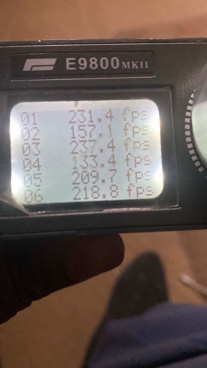 Hi I’m just using.20 bb just was checking what it chrono at I thought the roughly meant to be about 350-370fps.