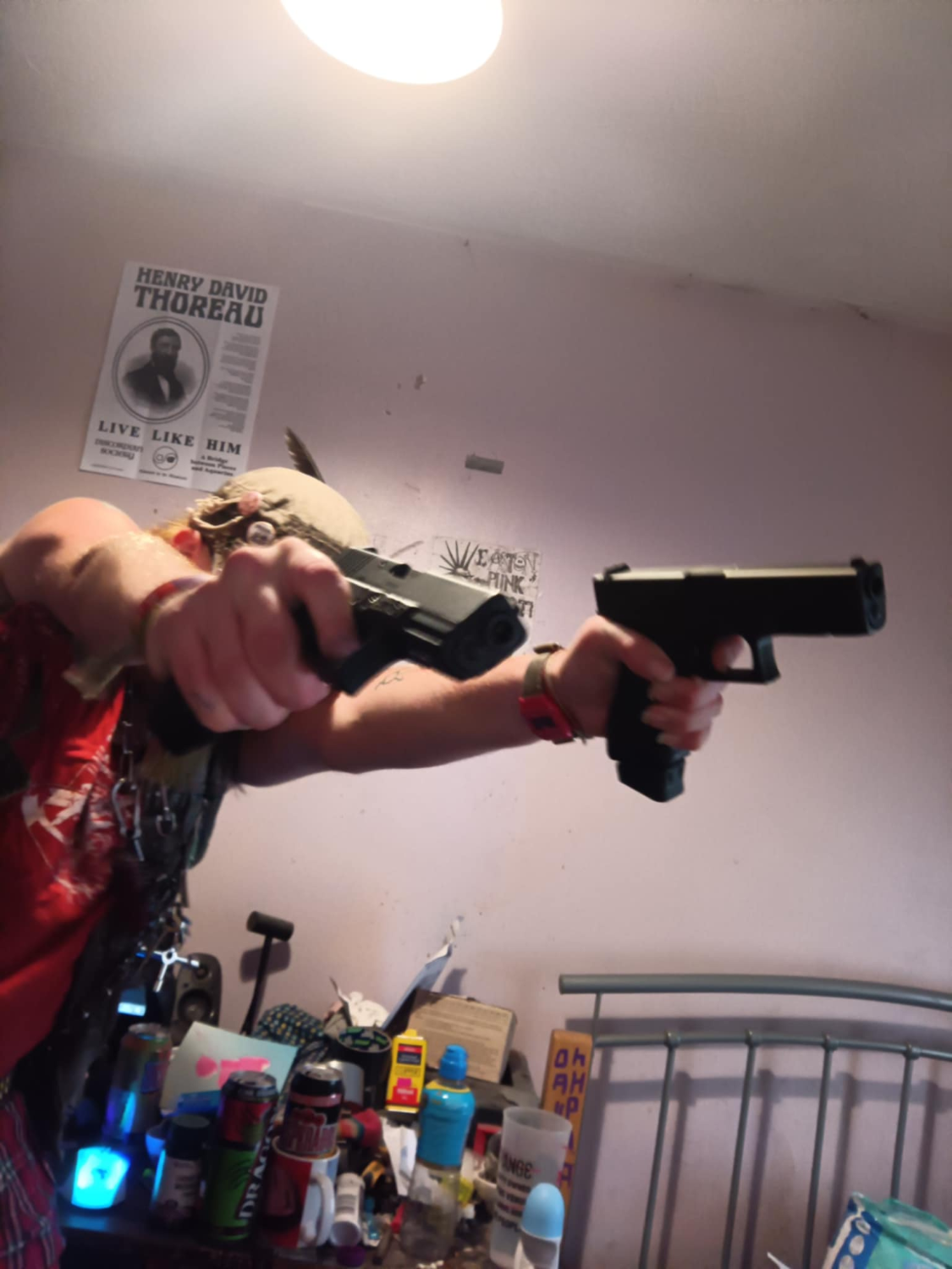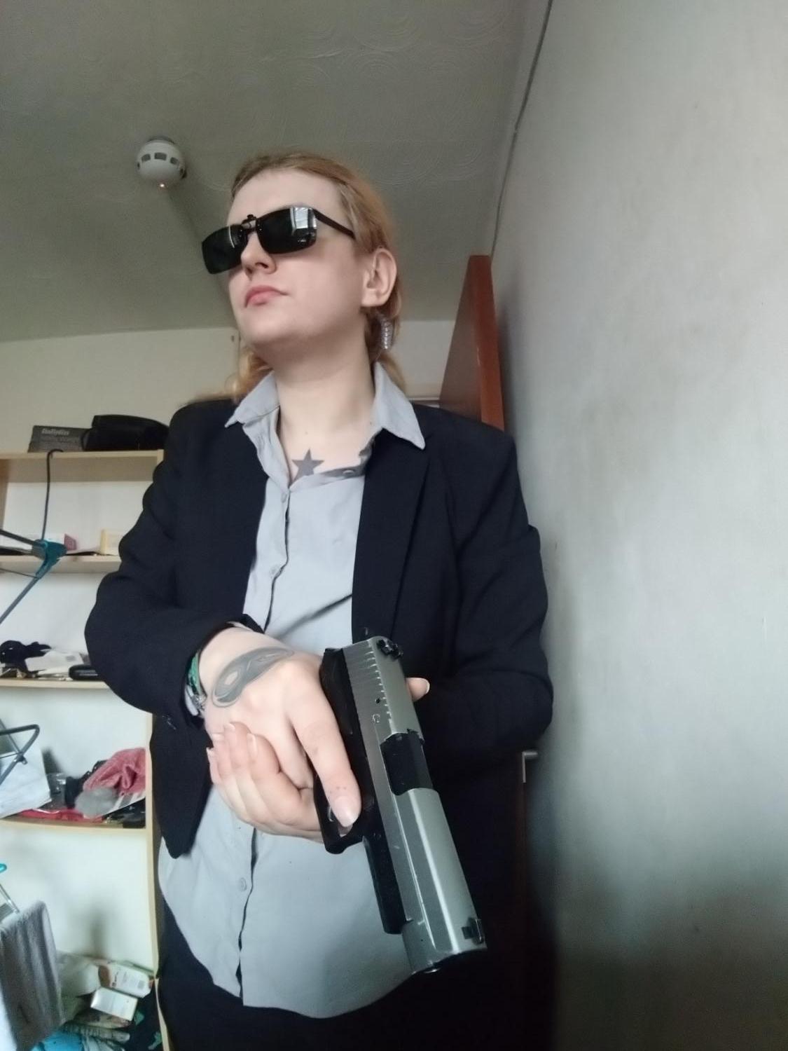 2. I mean, I never said the outfit was "gangsta"... Only likely criminal-adjacent in appearance due to the ACAB backpatch and ratty streetpunk vibe... But shooting completely inaccurately off hand only barely aiming with an oft-sideway pistol and being unlikely to hit shit is traditionally considered so, right? Although somehow even having to pardon the pride pins present I still perfectly progressed with precision despite my paltry pistol predicament, proving my partners proud in performance more perfectly than the parcel of pigs plaguing the playingfield perchance at that precise present.