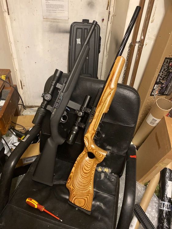 It’s got a sibling now thanks to @Cromulon1994 The Muzzelite is bang on 1.8j@100psi and semi auto locked, the Boyd has the Bolt action bolt in and is tuned to 2.32j@100psi Had to get creative with the Muzzelite, it’s a real stock for a normal 10/22, and the trigger reset distance is quite different. I took a couple of mm of material off the front of the trigger to give it a smidge more travel and now the sear can reset each time. Looking forwards to hearing the whispers in the queue for chrono trying to figure out what this is! Edit - thanks autocorrect -