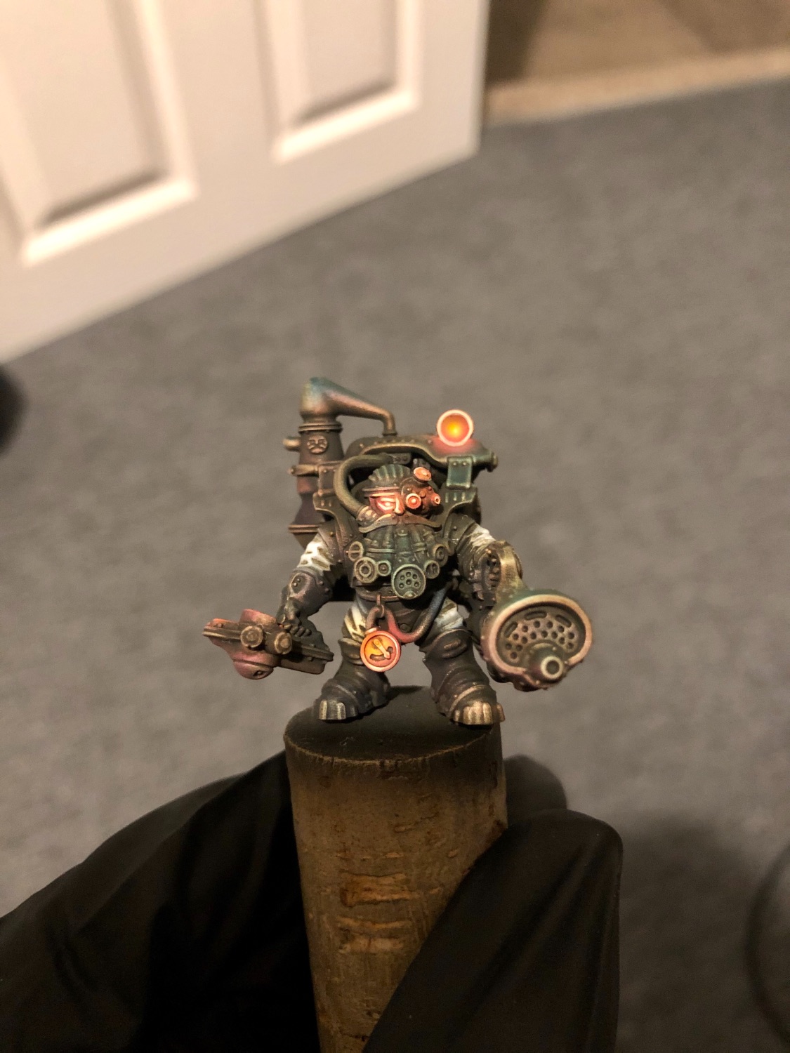 I used a semi-opaque liquitex ink rather than a wash (stronger pigment), took 2-3 passes to get it looking entirely filled. Assuming the consistency of the ink is right it shoud just run in to the detail off the brush, leave it to dry and clean up the surrounding edges with a q-tip and white spirit (the exact chemical you use here will vary on what 'paint' you use). Some use nail polish rather than paint, at which point use an acetone free nail polish remover. Truthfully if I didn't already have all the stuff to do I probably wouldn't have bothered, but it was a decent bordeom cure for all of 10 minutes haha. I tend to cheat with most of miniature painting and use a combination of an airbrush and enamel washes to make things look like they look me far longer to paint than they actually do, so it was nice to something which required a slightly steady hand for a change. That’s probably the last miniature I painted (about a year ago I imagine). I have an obsession with glowing details and tinted metallics.