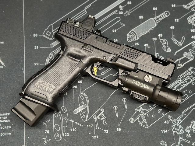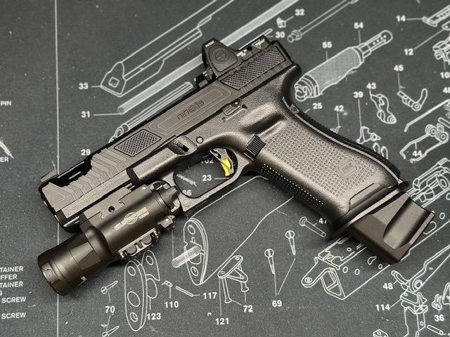 Latest glock to my collection. The G19 Gen3 Roland Special. Full Guarder lower tyrant Magwell bomber Roland special rmr cut slide kkm threaded barrel with Roland comp cct trigger tti infinity hop unit replaced the guarder hammer unit with a guns modify 5lb trigger pull kit.