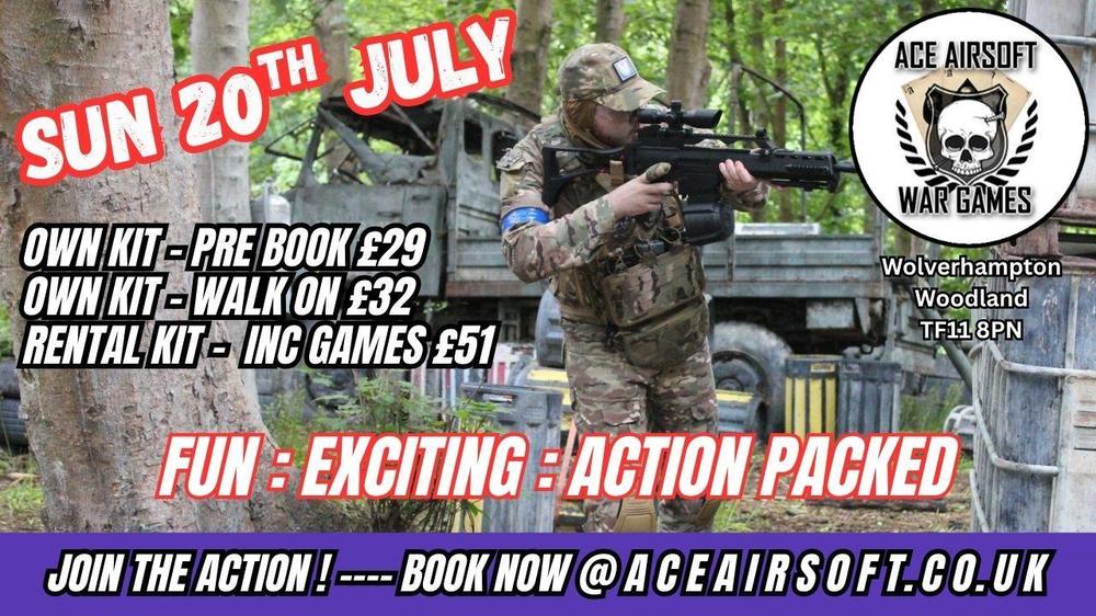 Sunday 3rd August + Sunday 24th August - 08.30am - 4.30pm Wolverhampton Woodland Game Site – TF11 8PN! We focus on Fun, Fairness & Safety during our game days, have a large safe zone & car park, friendly but firm marshals and an on site cafe for your lunchtime essentials. So grab a team mate and dive in to a Woodland battlefield full of Vehicles, Trenches, Bridges, Streams, Fortresses, Bunkers, Barricades and more over two amazing feature rich game zones. ? No experience or kit? No problem! You can hire equipment you'll need for an exciting and fun day, we'll brief you, and have you deep in the combat fun in no time - just select the rental option during booking. Expect: ⚡ Fun and Action Packed Games. ? Immersive Post Apocalyptic and Jungle themed battle zones. ? Teamwork and a lot of laughs. So if you are ready to level‑up your weekend: Book your slot now at ? https://aceairsoft.co.uk - P.S. spaces usually go quickly! See you all on the battlefield! ?