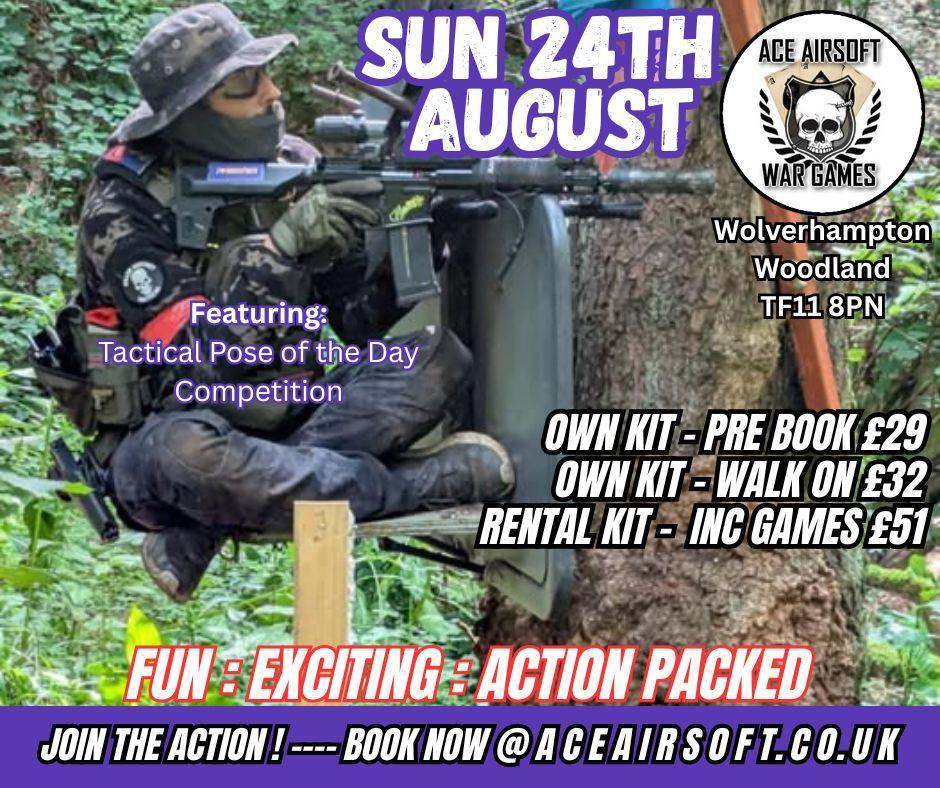 ? Sunday 24th August = Firefight Fun! ? @ Ace Airsoft Wolverhampton Woodland - TF11 8PN - 08.30am - 4.30pm. Featuring: 'Tactical Pose Competition' - Be our next game poster photo! 'Air Strike' - Each team will have one air strike that they can use at any time during the day against the opposing team, so choose wisely when to use it - team spokesperson required! Expect: ⚡ Fun and Action Packed Games. ? Immersive Post Apocalyptic and Jungle themed battle zones. ? A lot of laughs. We focus on Fun, Fairness & Safety during our game days, with friendly yet firm marshals. Our Woodland battlefield is full of Vehicles, Trenches, Bridges, Streams, Fortresses, Bunkers, Barricades and more over two amazing feature rich game zones. ? No experience or kit? No problem! You can hire equipment you'll need for an exciting and fun day, we'll brief you, and have you deep in the combat fun in no time - just select the rental option during booking. Book your slot now at ? https://aceairsoft.co.uk - P.S. spaces usually go quickly! See you all on the battlefield! ?