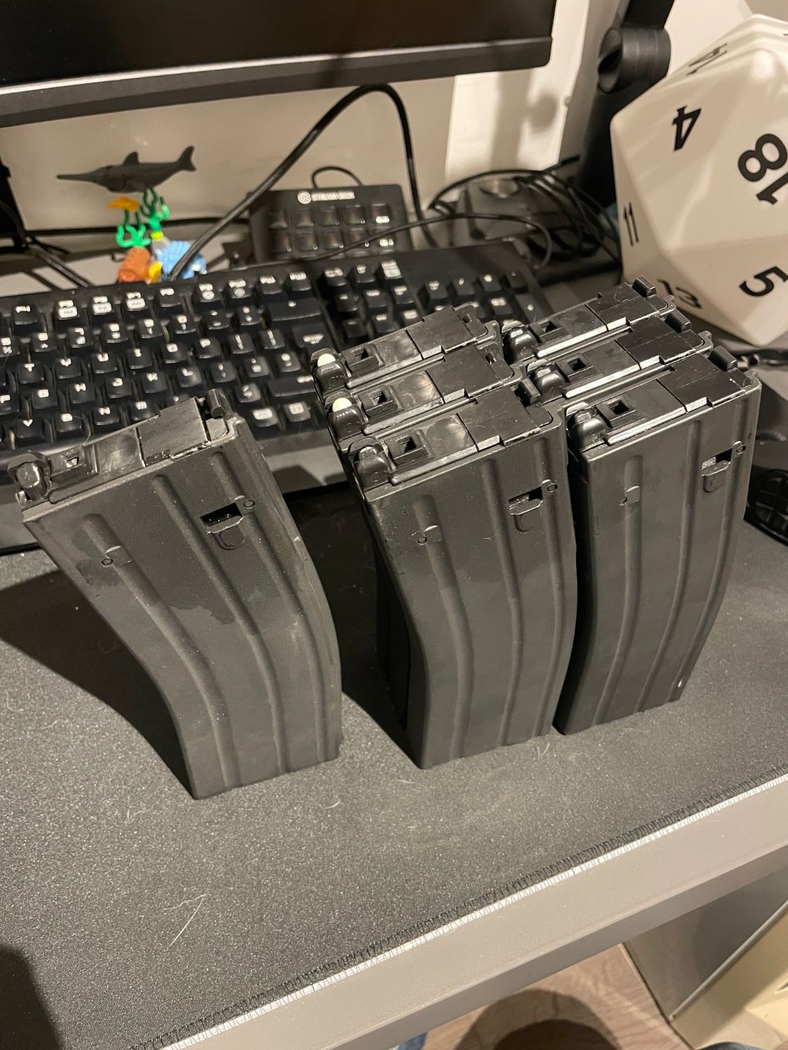 Hi folks, MAKE :lct MODEL: sr3m FPS: 340ish on.20 - currently has m95 spring as was shooting closer to 400fps originally Accessories: 6 mid/low caps 1 high cap, barrel extension. Looking for an appraisal for my LCT SR3m with barrel extension, 6 mid/low cap plastic magazines and 1 metal high cap. the barrel extension currently hides a 450mm 6.03 nuprol barrel but I’ve also got the original brass 6.03 that is 220mm if you prefer to run in it’s short configuration (swapping the barrel requires a full strip of the guns front end and gear box out so not for the faint hearted) it’s also fitted with a guarder silicone rubber & nub that loves .28s. because the battery space is none existent the previous owner removed some material from the gas block that’s hidden under the hand guard allowing the use of small 7.4 1000ma batteries. They now fit perfectly and don’t have to hang underneath prohibiting the use of the foregrip, which is usually the only option. The externals have picked up some weathering as can be seen in the image and everything is as solid as a rock.