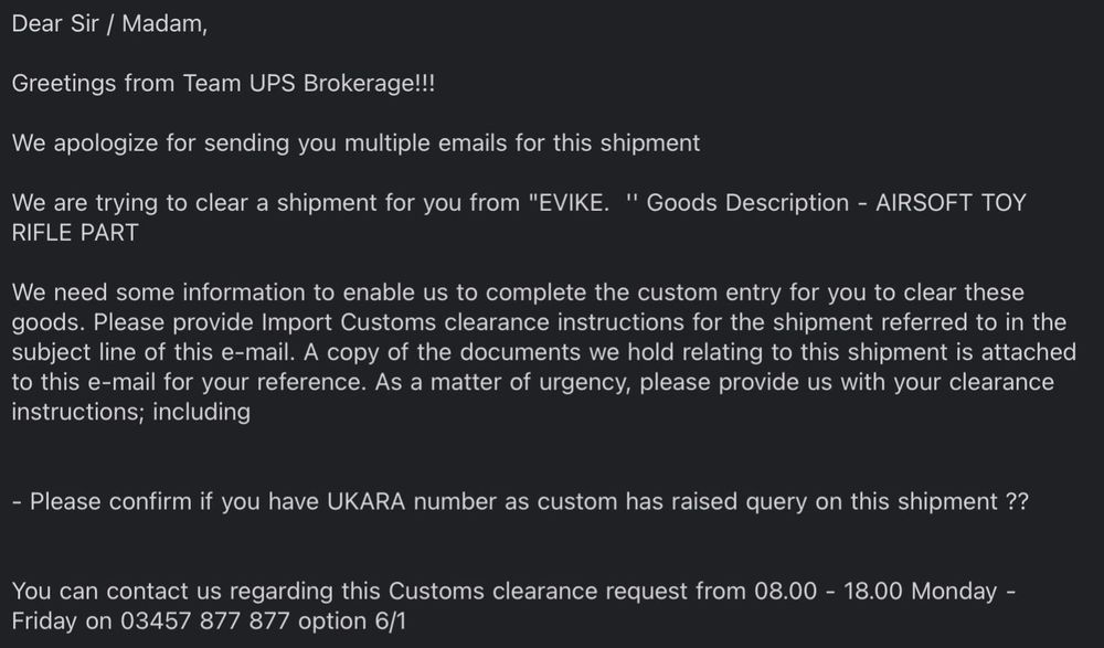 6. Well when I saw that I rechecked the order sheet from Evike and it looks like they've sent the item under commodity code: 99305 9950.. a harm code. I'm clueless with this stuff. All I can do is reiterate that I don't have a UKARA number and that the part is neither a RIF or IF, has no velocity and doesnt resemble a firearm and hope for the best. I'm just worried the harm code will snowball things.