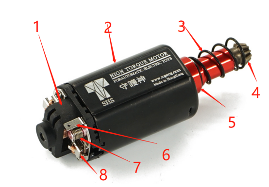 How to choose motor for gearbox? I have been playing airsoft for a long time and specialize in modification of motors and gears. Many friends don’t know how to choose a suitable motor, here I will share my motor research for the friends who need it. There are two types of motors according to the working principle, brushed motor and brushless motor. Brushed motor is widely used in airsoft for its low cost and good performance. Now lets talk about brushed motor first. A、Some common parameters of the motor Specification of motor The motors commonly used for V2 and V3 are 460, 470 and 480 motors. Taking the 480 motor as an example, 4 represents a rotor length of 40mm and 8 represents a diameter of 8mm. The larger the diameter, the more copper wire can be wound, which can improve the performance of the motor. Due to the limitation of installation space, 480 motor is the largest size motor that can be used by conventional airsoftguns. Long axis & short axis: refers to the length of the motor shaft. Motor for V2 gearbox is separated from gearbox, installed in the grip, it’s long axis motor. Motor for V3 gearbox is installed in a motor frame which is fixed in gearbox, it’s short axis motor. Torque: For easily understand, the torque is the power of the motor. The bigger the torque, the stronger the power, and the larger spring it can driven. Rotating Speed The speed of motor’s no-load rotation, the higher the speed, the higher the RPS. Usually there will be a mark of voltage and rotating speed on the motor, for example, 11.1V 28000RPM. TPA: Turn per Arm. The number of coils wound on the rotor, mainly affects the speed. Generally, the higher the number of turns, the lower the speed and the lower the heat generation. Many people like to use TPA to judge the performance of a motor, but this is not a scientific way. Don't worry, continue to read this article, I believe you will understand how to comprehensively judge whether a motor is suitable for you. Magnetic tile type Ordinary magnetic tile and strong magnetic tile: Usually, the stronger the magnetism, the larger the motor torque, the shorter the startup response time, the higher the electromagnetic conversion efficiency, and the faster the motor stops. Ordinary magnetic tile: It is a black magnet, general magnetism, belongs to low torque motor. Mostly used for some cheap original guns, why? Because the cost is low enough. Strong magnetic tile Commonly used are NdFeB rare earth materials, according to the process, it is divided into two types: bonding and sintering. The bond magnetism is medium, generally used for medium torque motors, Sintered magnetic is the strongest, usually used in high torque motors. Since NdFeB is easy to oxidize, the magnet needs to be electroplated, and the surface will be electroplated silver. Through the motor shell, we can observe the magnetic tile to identify. (Note that many fakes will also use ordinary black magnets to pretend to be NdFeB magnets by electroplating or painting silver) Depending on the performance of the magnetic tile, common specifications are as follows: N35 N35M N35H etc. N35 refers to the magnet material code, the common ones are N28, N30, N33, N35, N38, N40, N42, N45, N48, N50, N52, (N56, N58). The larger the number, the stronger the magnetic performance and the higher the price. The most commonly used ones for making 480 motors are N35, N38, N52. For cost reasons, magnets above N52 are rarely used to manufacture 480 motors. N52 is currently the strongest 480 motor magnetic tile. The code behind the number refers to the temperature resistance level. Without exceeding this temperature, the magnet will not demagnetize significantly, and doesn’t affect performance. For the same letter, the temperature resistance limit of each magnet tile grade is not exactly the same. The summary information is as follows: No letter: 70-80°C M:100°C H:120°C SH:150°C UH:180°C EH:200°C AH:240°C If it is a normal N35 magnet 480 motor, due to the continuous heating of the motor, when the temperature exceeds 80°C, there will be permanent loss of magnetism, the higher the temperature, the bigger the loss. Therefore, some guns will feel that their performance has decreased after a period of use, which may be caused by the performance loss of the motor, especially for gearboxes using electronic trigger unit, when playing single shot, the electronic trigger unit frequently brakes the motor, the temperature rise will be more obvious, and it is easier to exceed 80°C for long-time use, and a magnet with a higher temperature resistance must be used in order to maintain the durability of motor performance. According to my personal experience, it is recommended to use H level or above to better protect the performance and life of the motor. Of course, the higher the temperature resistance level, the higher the price. Another rare-earth permanent magnet used in high-torque strong-magnetic 480 motor is samarium cobalt magnet. Compared with NdFeB magnets, the temperature resistance limit is higher (the highest temperature resistance level can exceed 500°C), but the disadvantage is that the magnetism is weaker and the cost is higher, it is not the best choice for gearbox motor, therefore, the current mainstream high-torque strong-magnetic 480 motor use NdFeB to achieve a balance between comprehensive performance and price. B、Structure of 480 Motor 1. Bottom cover 2. Motor shell 3. Fixing spring 4. Motor teeth 5. Shaft sleeve 6. Electrodes 7. Carbon brush fixing spring 8. Carbon brush
