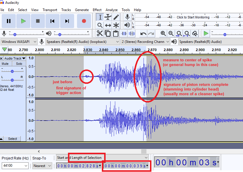 You can use Audacity to measure trigger response or ROF or even for general diagnostic by getting an idea of how it cycles. Basically you can set it to record whatever sound you computer is playing, and you just click record and go watch a video and stop recording once you get the sound you need. And then here is my method of interpretation and it works for comparison purposes: