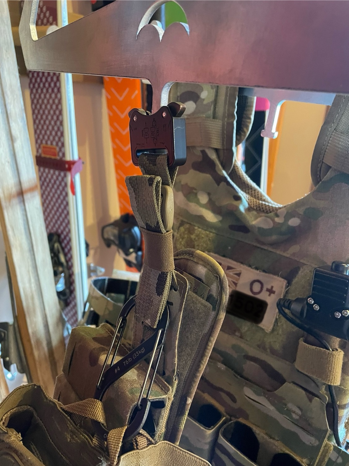 Probably more of a want than a need (although, isn’t everything in airsoft a “need”, at least when justifying to OH…?), these nifty aluminium kit hangers from Luminae - plate carrier and Cobra buckle equipped belt nicely stored on hanging rail in the garage: