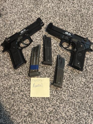 2007(?) Western Arms Beretta ELITE IA x2 with 3 magazines. Believed to be in working condition, but 2 magazines are missing their routers and leaking, one holds gas and appears to be complete but I think the output valve gets stuck forward so it just dumps all its gas. Not really sure what to price these at, as they’re vintage maybe £110 posted for both?