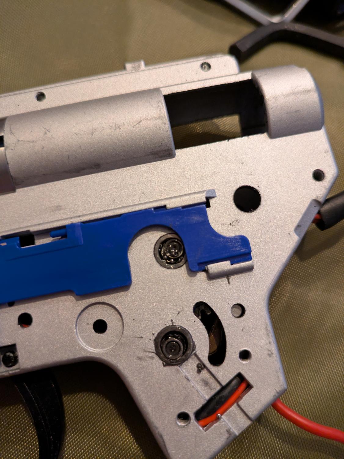 Last weekend I killed my Specna Edge, I'd dropped some 14:1's in as I'd calculated that with the motor I was running I would get about 24-25rps on 11.1/3s and a more realistic 18rps on 7.4/2s. Lo and behold after fitting the gears and re-shimming it came out great. I am lucky to have access to a piece of private woodland and we tend to play semi or burst, no auto allowed. I was very much enjoying my new improved RoF when in the last twenty minutes of game day I noticed it started to miss the odd BB, I changed mag thinking it might be this, then it started making a grinding sound. I stopped and switched to the communal "backup" Specna flex M4 we collectively purchased for such occasions. Stripping it down at home showed that the bearings had disintegrated on the selector plate side of the box. The bevel gear and spur had dropped and teeth were partially ground off the bevel in the couple of short trigger pulls it took for me to go "wtf is going on?" and realise I had a problem. On the day I was running a brand new 11.1/3s 2200mah turnigy nano-tech battery with a max discharge rate of 70c, so I think this may have pushed my rate of fire up a bit, as I imagine there would be very little voltage drop under load on this compared to my older butterfly/nunchuck lipos. I'll be fitting bushings, and see how that goes. -