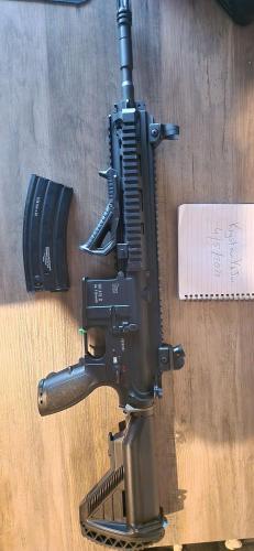 Has been converted to deans connectors. Has an added single sling attachment on the buffer tube. Will come with original trademarked mid cap 120 round magazine. Will also come with angled grip as pictured