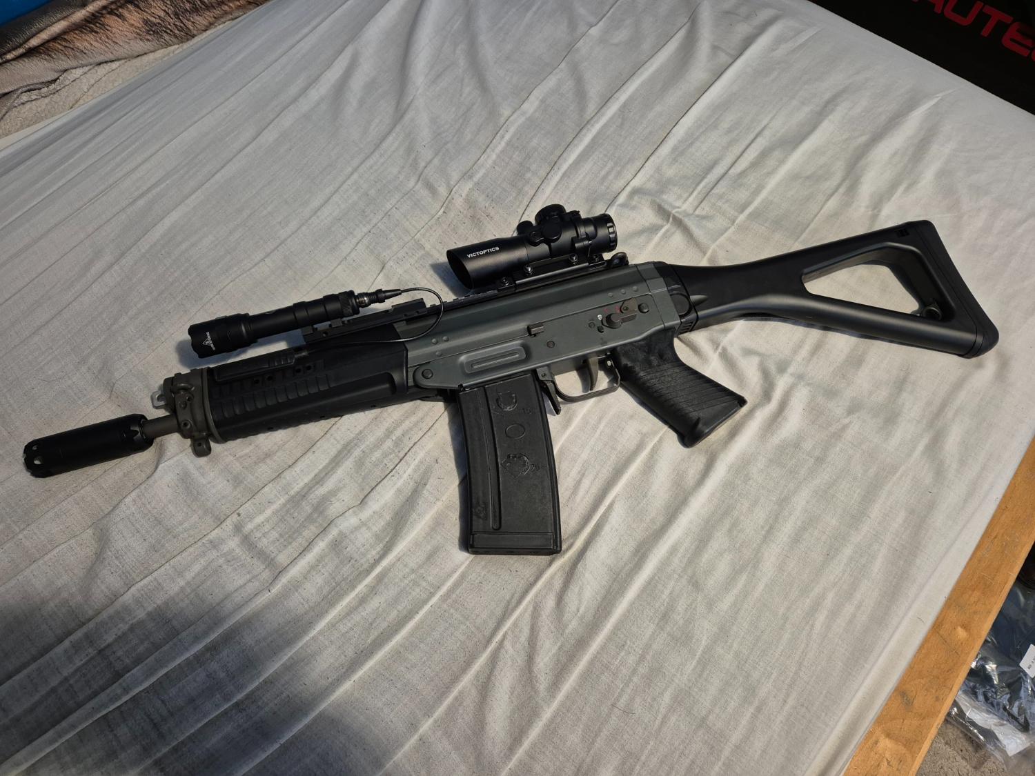 I suppose i'm a purist in the sense that i really like the standard 553 stock and grips. ? I only bought the hop-up on the basis of it being an available upgrade. I have no idea how to fit/adjust it yet. All that matters is that you like it and it works for you. I'm a bit boring in how i like my guns. A laser has arrived: I have two more on the way but this one might stay, it's just the perfect size. Clears the light mounting and below the sight lens. This might be this gun finished on the outside.??