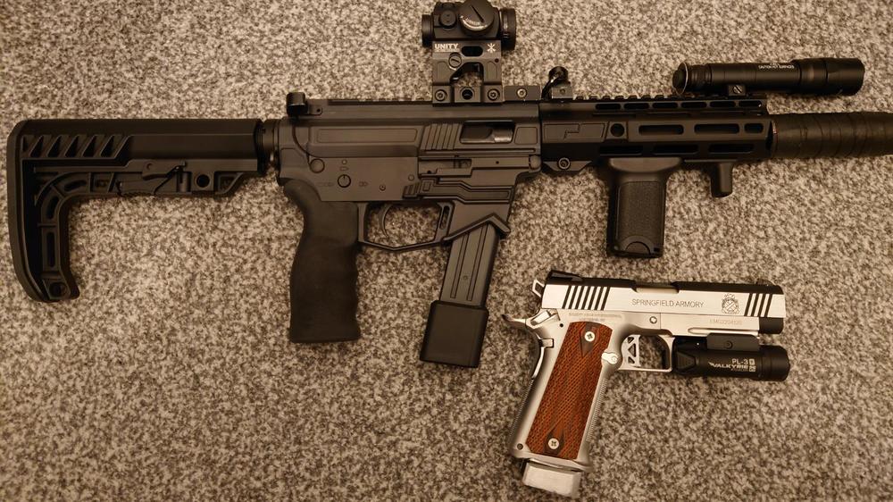 Price included Postage, and the following 1)RIF and one Original Savia magazine 2)Spare nozzle and spare mag release button (They are the plastic made proprietary parts so for your peace of mind) 3)Olight USB rechargable Sigurd 1450 Lumen foregrip flashlight (This can be sold separately at £40) ------------------------------------------------------------------------- Details on the RIF - Savia PCC lower, DE Ghetto Blaster stock, and DE Ghetto Blaster upper - The stock has 3-position adjustable length - Only upgrade I had made is nine ball(Laylax) hop bucking, and it shoots straight and accurate - Shoots at 290fps at 0.25g - I modified the dust cover so it doesn't block the right side bolt release, as well as making it looks more like a pistol rounds ejection port rather than a 5.56 port. The cover open and closes fine as a normal AR style GBB - Most parts are MWS compatible, except nozzle, mag release, trigger box case, right side bolt release (left side is normal M4 style and MWS compatible), and a few extra parts inside trigger box for Hi-capa mag mechanism. Things like hammer, sear, trigger, bolt carrier, hop unit, charging handle etc are MWS compatible -----------------------------------------------------------------------