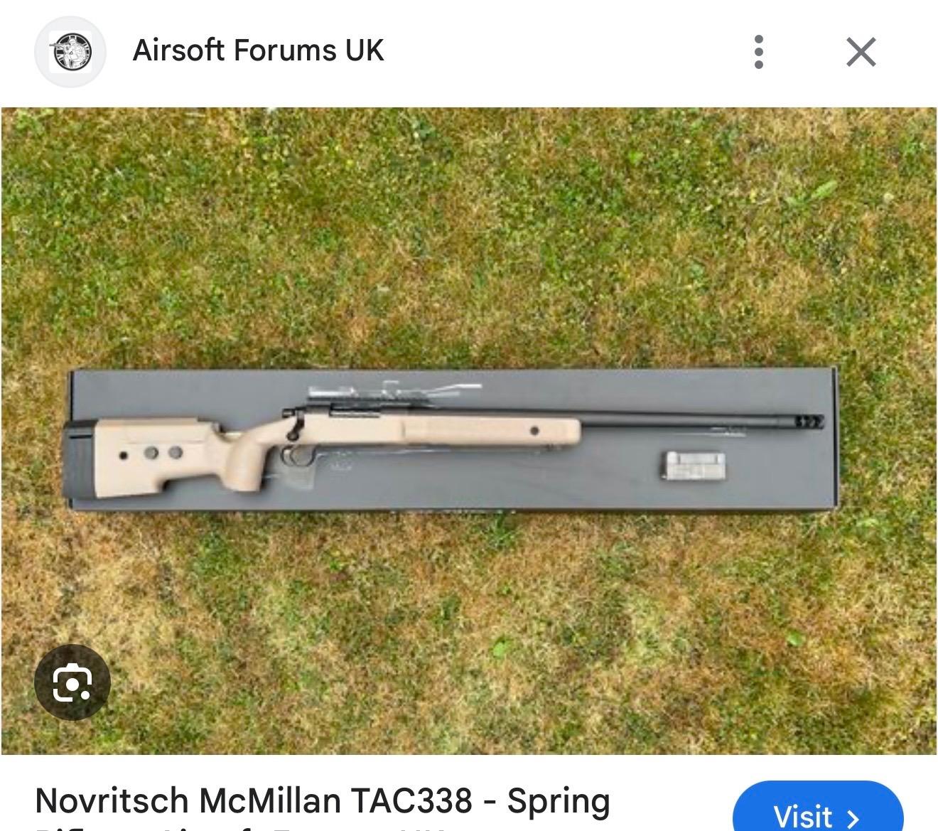 1. Hi guys looking for this sniper replica , same colour same model, doesn’t matters the brand or that is gas or spring. I want it for my collection and has to be like brand new. Anyone who knows where to find or got it for sale, please contact me McMillan TAC338 Tan