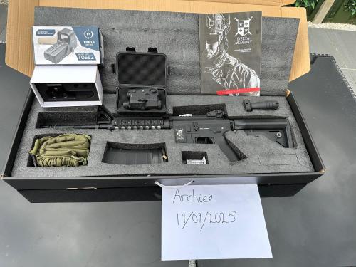 Selling it with the replica eotech and peq box. the peq box works as you can see. the eotech sometimes works and sometimes doesn’t so that’s no included in the price.
