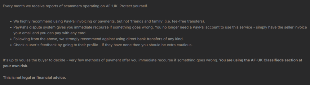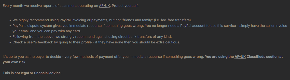 Not going to add any sort of post requirement before accessing the classifieds and probably never will. Whilst this does leave users slightly more vulnerable to scammers the classifieds are the primary access point for new members (some of who eventually become frequent contributors to the remainder of the forum). I'll also add that the relative success of AFUK's classifieds is that it allows buyers to contact sellers far more easily than some similar platforms (which then translates into items selling more quickly). If a change was made to accessing the classifieds it would probably work for an extended period of time but there would be a drop-off in new listings on the classifieds in the medium to long term which would precipitate as less content overall on the forums. Facebook and Discord are not only popular because everybody is already on there (in many cases multiple times a day) but because you don't even have to think about doing any amount of legwork before contacting a potential buyer or seller. Closing the gap between forums and big services like this starts at having as little extra work for new users as is feasible. The above is also why care has to be taken before adding new sign up requirements in order to help prevent spamming (I'm sure everyone is familiar with just how much of this we get). There is currently a cap on how much 'content' you can post/create before you reach a certain account age - this is intended to be one of a number of small things that frustrate people spamming and scamming at scale but it is a bit of an arms race with no solution that doesn't come at the cost of significantly lower new registrations. Did consider a 'bond' at one point of a similarly small amount which would be refunded after a specific period of time but this comes with loads of real life liabilities. Also as above any non-refundable small contribution for buyers and sellers would probably be catastrophic for fresh sign ups I'm afraid. I am likely going to add a new notification to make this more prominent to new members. As it stands there are two notifications that you receive as a new member and it's likely that adding a third won't help. There is of course the floating permanent notification at the top of the classifieds with a warning and some very basic guidelines. Any concise recommendations to add to this list of tips would be greatly appreciated. I've asked for clarification on this but for now the forum does not notify of new classifieds on Discord as we're probably not allowed to even link to new listings under these new guidelines. Although it's not exactly foolproof prevention of anybody who does a little bit of research on this (thankfully most scammers seem to be pretty thick) we do screen IPs (for anti-spam purposes more than anything) in order to catch VPNs etc. (to the degree that it is feasible to do so). Agree wholeheartedly. This is the first recommendation in the list recommendations given at the top of the classifieds for a reason. Anybody looking to save a couple of quid on a transaction of hundreds of pounds with somebody they don't know is asking for trouble.