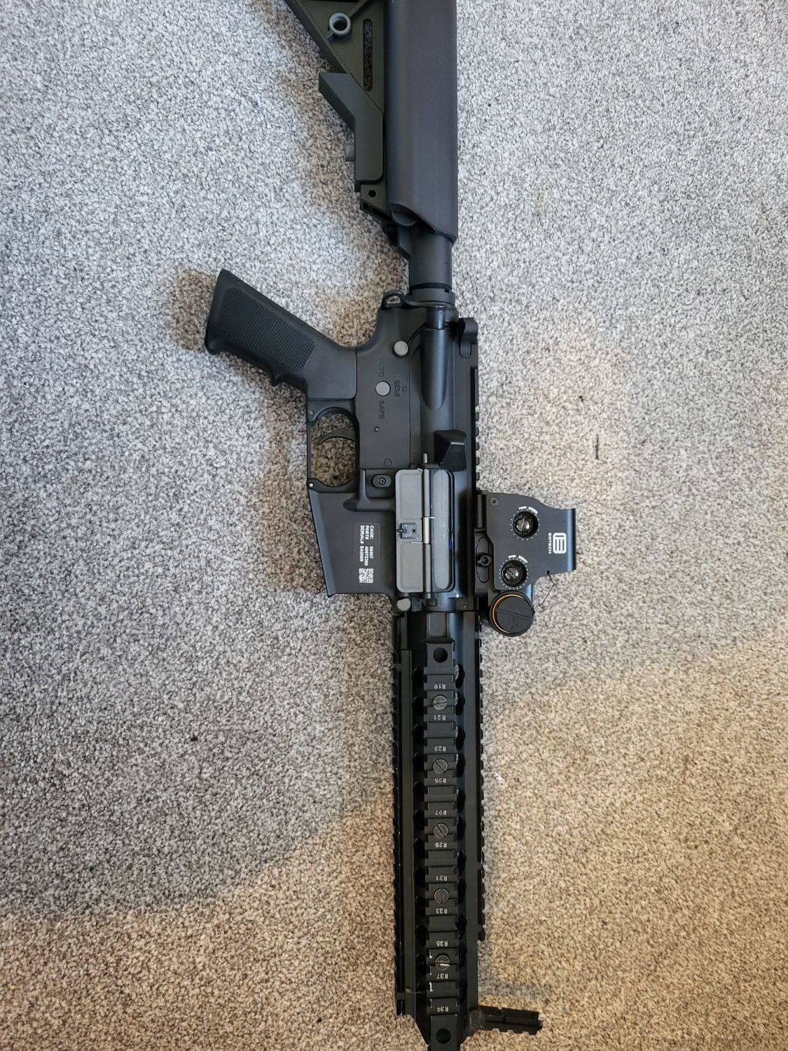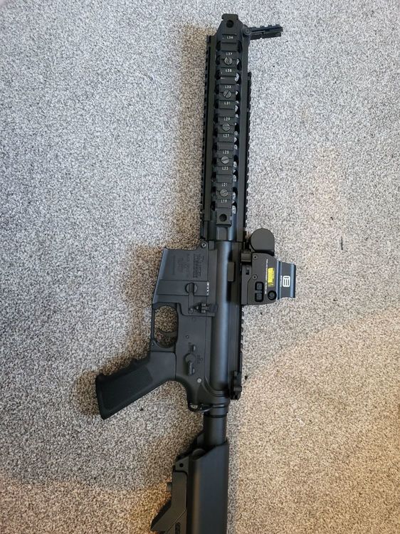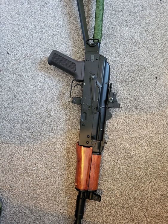 Hi all, I'm hoping for some appraisals for some of my kit that I'm considering selling. First up, Specna Arms SA-e19 edge: Internally it is stock, bought new, put about 500 rounds through it but then bought a TM M4 and took the handguard off this and put it on the TM. The Specna now has an SR15 style rail instead; the barrel is shorter than the handguard as I was going to do an integrated suppressor style build. It's not a perfect fit and it relies on the bolts on the handguard clamping into the outer barrel. No gas tube/block. Will come with an Ali Express Holo sight as pictured. No batteries, possibly got the 2 mags it came with. Next up; Cyma ak74u Bought second hand from this forum last year but I'm about to upgrade to a recoil AK. This will come with 1 mag. No batteries. Optic and rail mount not for sale as these will be going on my new AK. I've probably put about 400 to 500 rounds through it only as I didn't have any batteries that fit. I suspect it might be an ex 2 tone as there are a few little flecks of red pai t here and there but only noticeable up close. Aaaand finally, Ares "Honey Badger". This is a very reluctant sale as it has been a go-to for many years now and has been brilliant. Won't come with any accessories pictured, no battery and 1 or 2 mags. Internally stock apart from the gearbox spring (possibly a Guarder m95? Shoots around 320 fps on 0.2). Externally has a few little bumps and knocks as it's had good usage. My guesses are: Specna: £180 Cyma: £100 Ares: £130 Thanks for looking.