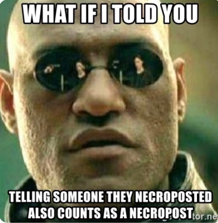 Cannonfodder Posted November 12, 2020 Posted November 12, 2020 But is it necroposting if you tell someone they're also necroposting when they post to tell someone else they're necroposting? ??