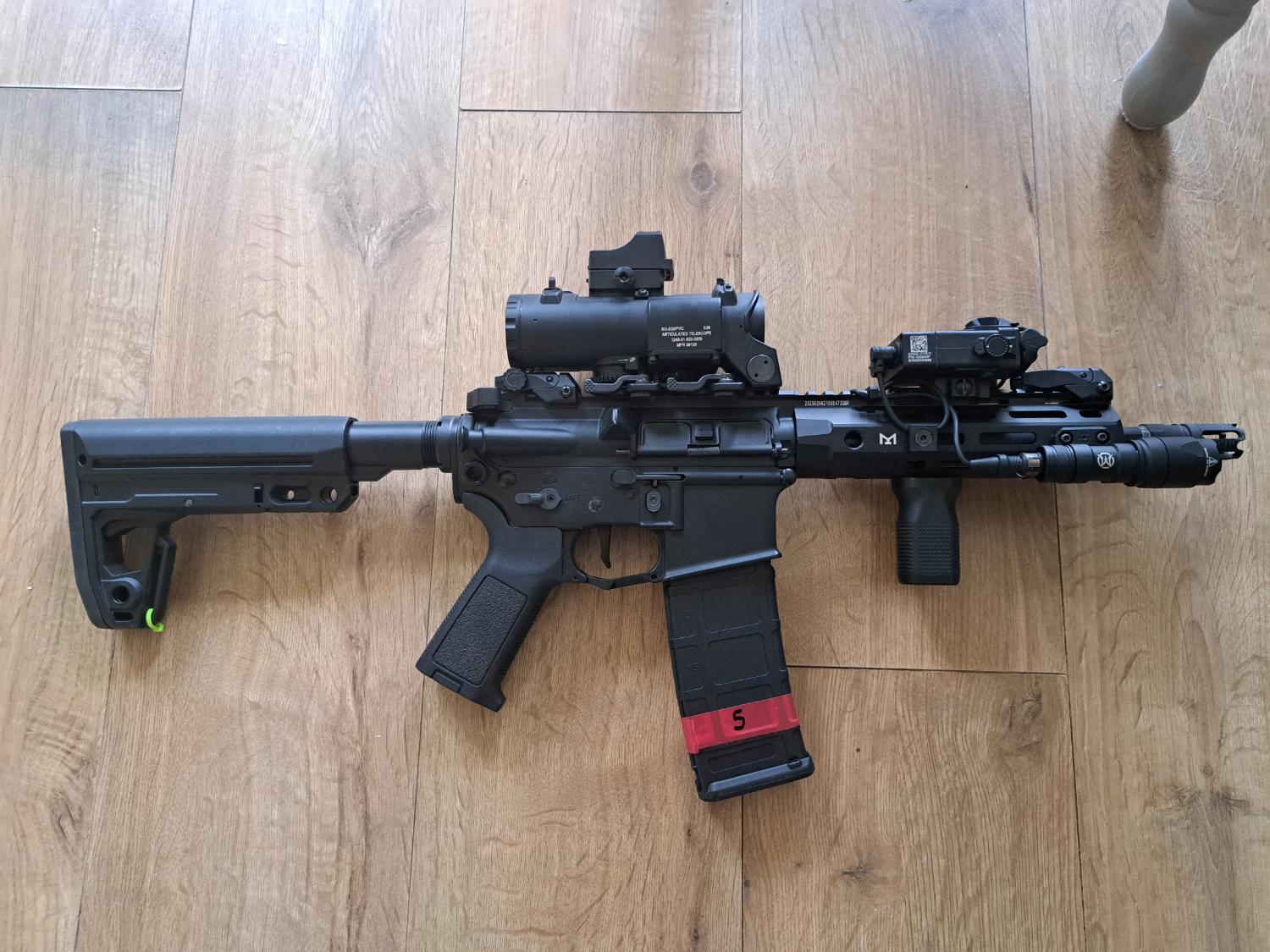 Popular Post Skara Posted July 1, 2024 Popular Post Posted July 1, 2024 Did a bit of a revamp of my 10" M4.... It's now a 5" M4. Used a spare Specna upper receiver I had, got a new 5" carbon fibre barrel, moved the ARP-9 handguard from my AAP carbine, cut down and recrowned an old Guarder 363x6.02 barrel, replaced the cylinder (from 4/5 hole to 2/3), random spring (m100? m110? who knows) and now I have a very smol boi. Why? Because I want lightweight and compact for long tournaments, this horrid thing is very consistent in Joule output and spread (very surprising given the silly short barrel), plus I'll be strapping a thermal scope onto it at night, the more weight I can shave the better. Powered by a funny 7,4v 1800mAh 130/65c battery that gets me in the 25 RPS region (by sound, need to confirm via chrono). As always, functionality over aesthetics. P.S. G43 + FTC is on there just for show, I don't really use it. Ryan-B, Egon_247, gavinkempsell and 2 others 4 1