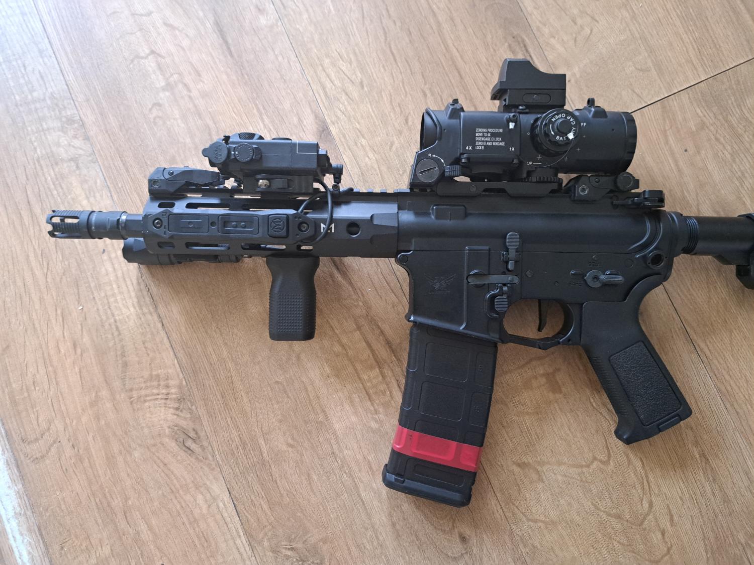 Herrgh Posted July 1, 2024 Posted July 1, 2024 After 10 years of playing, I finally have the cash and the knowledge to buy all the bits and bobs to make a tricked out rifle that has all the attachments that I neeeeeeeeeeeeeed. Being an adult finally has its perks! This comes after a little binge on Aliexpress for the final little pieces. Double Eagle M906C (completely stock and still kicking ass). PTS EPF-M MLOK foregrip. SOTAC Elcan Spectre 1x - 4x Scope WADSN M300A flashlight, on an ARIS Type 2 clone MLOK mount. WADSN DBAL-A2 Laser/light module (Red laser, flashlight, strobe, and IR laser). WADSN 3-button control unit thing with two leads for both the flashlight and the laser module. 3rd button is an ON/OFF switch (not momentary) for the flashlight. Mounts via MLOK Arson Machine MLOK and RIS-based "cable management solutions". Really pleasing stuff tbh. I love retail therapy. Last thing to get is some dinky little tracer unit, as my intention is for this to be my indoor gun now that it can light up a room and I can see where I'm going. gavinkempsell, Egon_247, Galvatron and 1 other 2 2