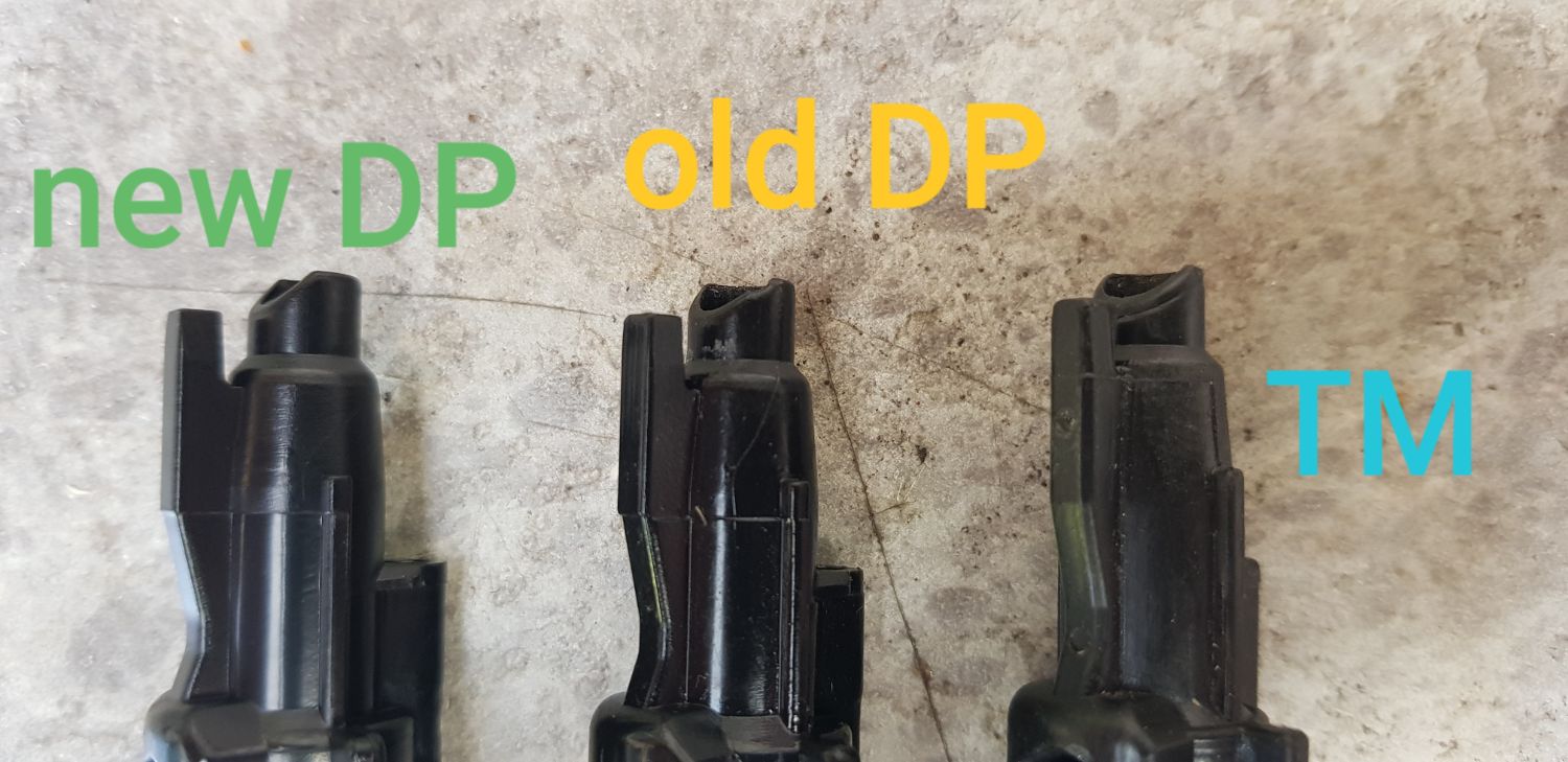 Stand them up vertically and see if the new DP nozzle protrudes a tad more. To me it seems the head of the nozzle seems a tad longer than the Marui one. But it may well be the way the pic is taken.