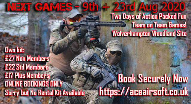 Ace Airsoft War Games Posted July 23, 2020 Posted July 23, 2020 We have two action packed game dates lined up for August 2020, Sunday 9th August and Sunday 23rd August. Both dates will be limited numbers for each game on a first come first served basis and also have social Covid-19 safety and social distancing measures in place. So don't miss out on the pewpew action and get booked in ASAP ?.https://www.aceairsoft.co.uk/next-game.html Hope to see some of you there :)